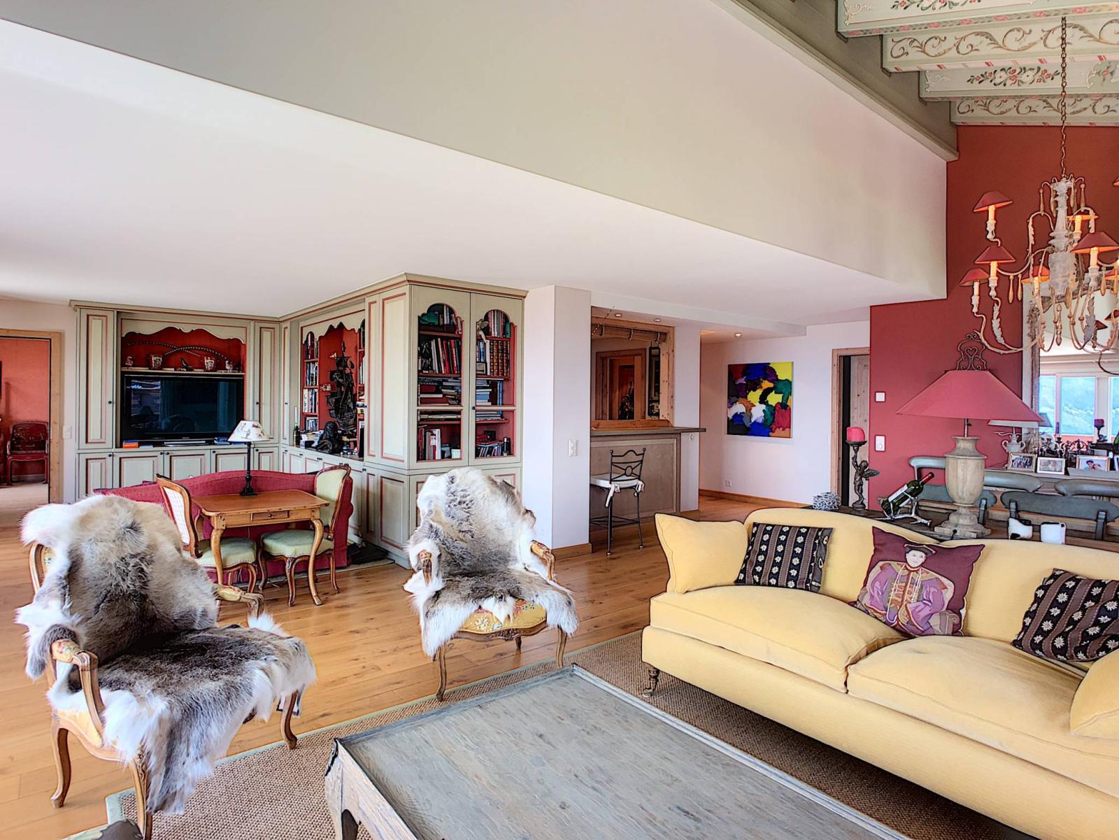 Diese sehr schöne Wohnung befindet sich in einer Luxusresidenz und bietet eine der schönsten Aussichten von Crans-Montana (Panoramablick auf das Rhonetal bis nach Martigny und die umliegenden Berge). Sie hat eine Fläche von ca. 191 m2 + 21 m2 Zwischengeschoss sowie Balkone von insgesamt 60m2.