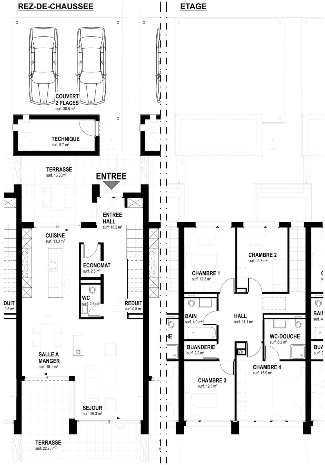 Die großen und hellen Räume werden Sie verführen, die warme und gemütliche Atmosphäre des zukünftigen Villenviertels wird Ihnen das Gefühl geben, zu Hause zu sein, die beiden schönen Terrassen ermöglichen es Ihnen, die optimale Sonneneinstrahlung ganz nach Ihren Wünschen zu genießen, und schließlich ein überdachtes Auto mit 2 Plätzen Vervollständigen Sie jede der Villen.