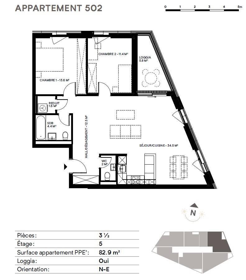 Die vorgeschlagene Wohnung mit Nord-Ost-Ausrichtung im 5. Stock ist wie folgt aufgeteilt: