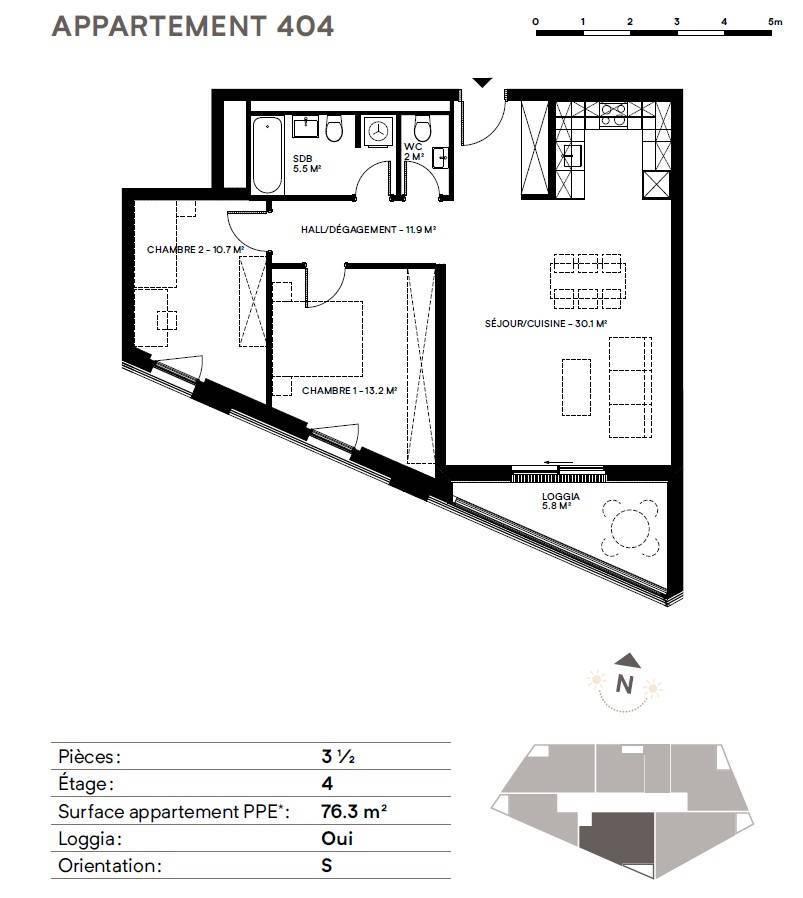 Die vorgeschlagene, nach Süden ausgerichtete Wohnung im 4. Stock ist wie folgt aufgeteilt: