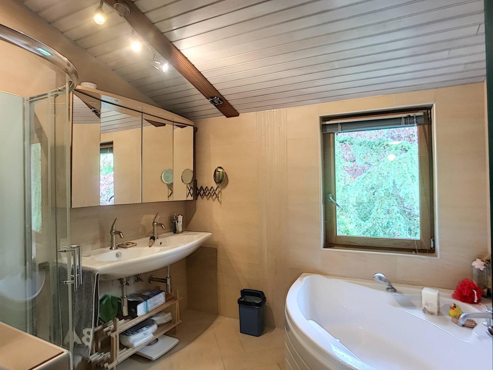 Draußen verfügt es über 2 Terrassen (eine davon überdacht), einen Teich sowie einen gut bewaldeten Garten (Wunderbaum, Quetschier, Apfelbäume, Ahorn, japanische Kirsche, Kiefer, Zeder usw.). Der Hof, der zum Haus führt, bietet 3 Außenparkplätze. Ein weiterer Parkplatz ist am Ende des Gartens zugänglich und eine Doppelgarage (mit automatischem Tor und Stauraum) vervollständigt diese Immobilie.