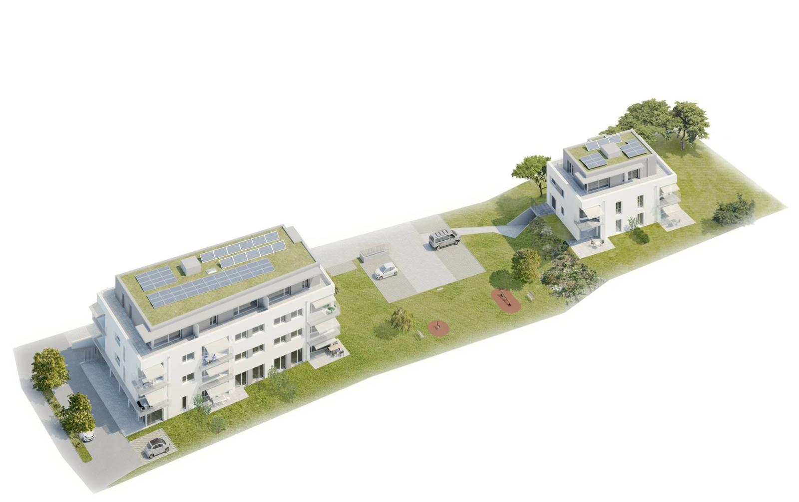 Grünflächen mit Bäumen und ein Spielplatz beleben den Raum zwischen den beiden Gebäuden.