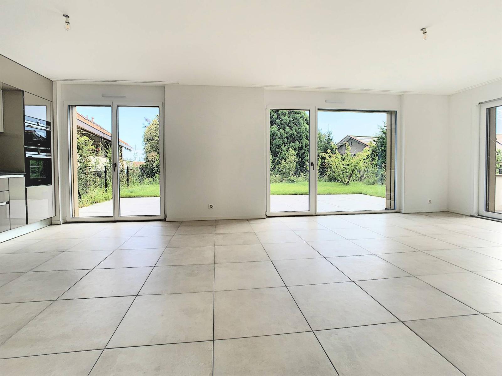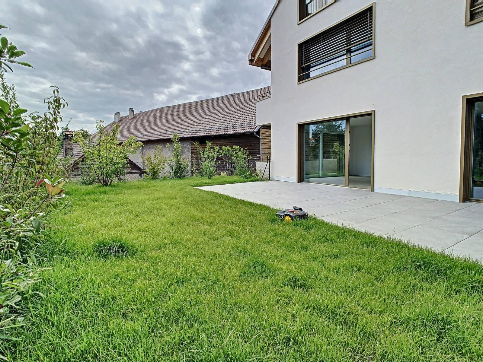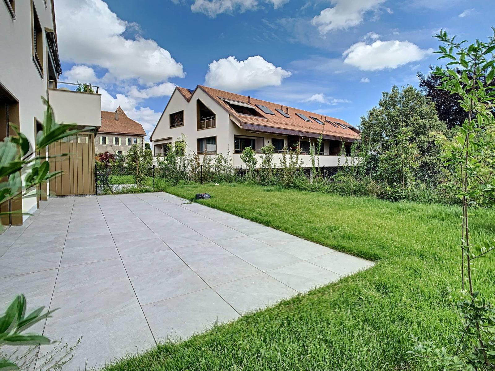 Diese luxuriöse 3,5-Zimmer-Wohnung mit zwei Bädern und einer voll ausgestatteten Küche profitiert von einer großzügigen Terrasse von ca. 51 m² und einem nach Süden ausgerichteten Garten von ca. 82,3 m². Die hohen Decken vermitteln ein Gefühl von Freiheit und Raum, ein Favorit.