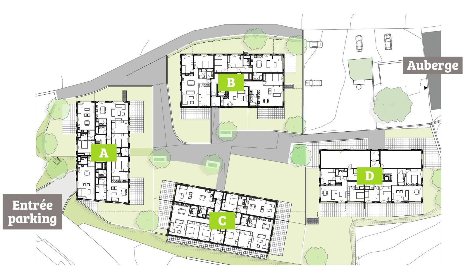 Das Ganze besteht aus vier Gebäuden im menschlichen Maßstab. Die 41 Unterkünfte, vom Studio bis zum 4,5-Zimmer-Apartment, bieten großzügige Volumen sowie großzügige Balkone oder Terrassen und eine Tiefgarage runden das Paket ab (2 Parkplätze und ein Keller für dieses Grundstück).