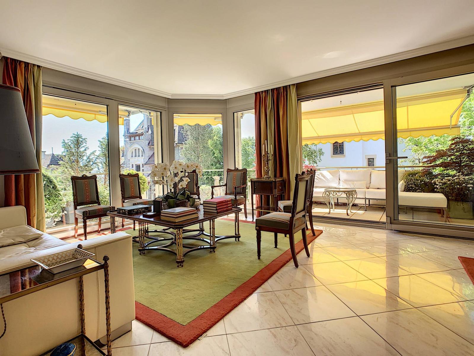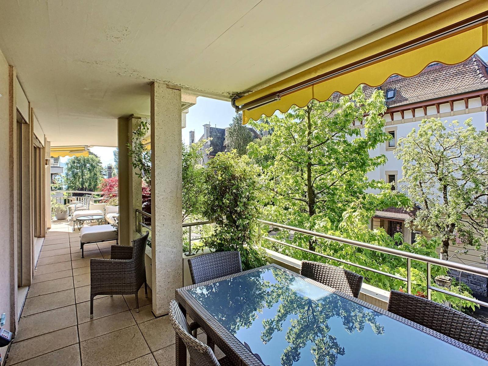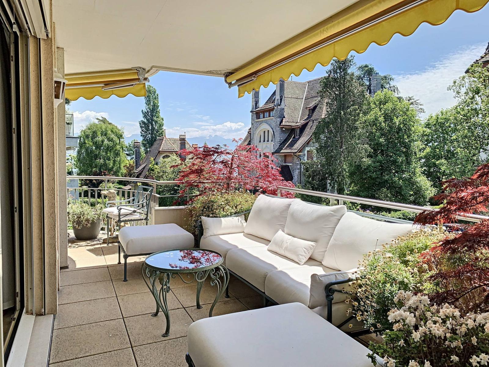 Eine großzügige und helle 180 m² große, offene Wohnung mit herrlichem Blick auf den Genfersee, hochwertiger Ausstattung und geräumigen Zimmern, umgeben von einer 45 m² großen, nach Südosten ausgerichteten Terrasse.