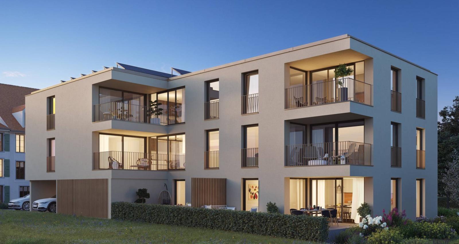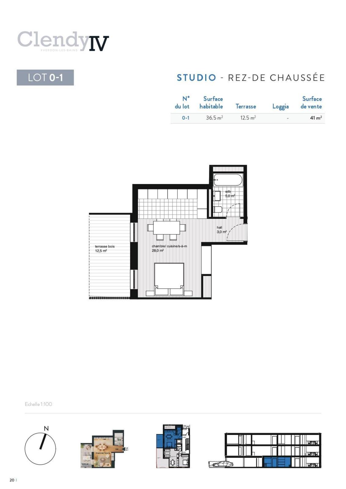 Bei der Parzelle 0-1 handelt es sich um eine 1,5-Zimmer-Wohnung im Erdgeschoss, mit einer Wohnfläche von 36,5 m2, mit einer Terrasse von 12,5 m2. Es besteht aus einer Eingangshalle mit Bad, einer zum Esszimmer offenen Küche und dem Wohnzimmer.
