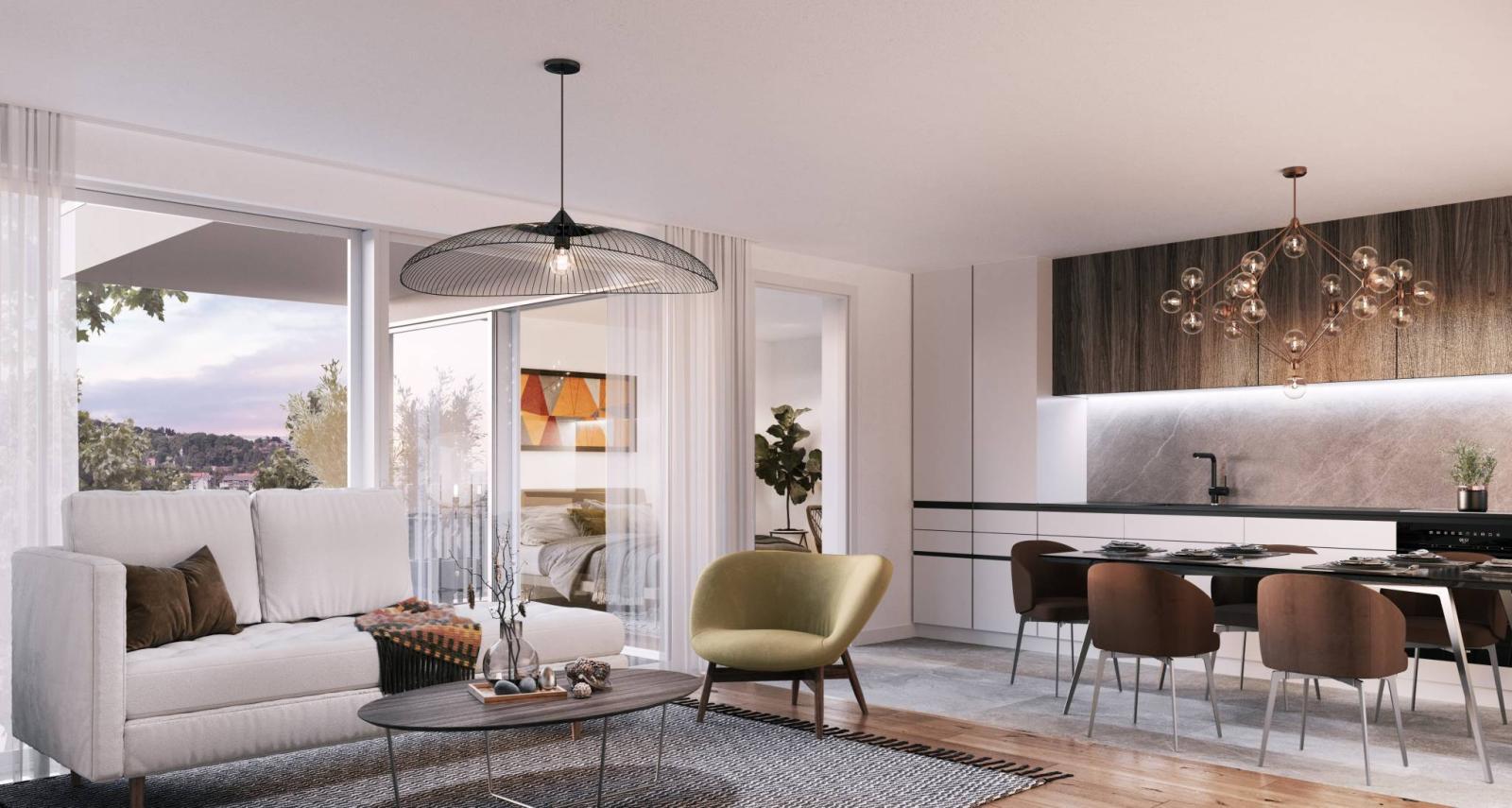 Die angebotenen Typologien reichen vom Studio bis zum 3-Zimmer-Apartment. Jedes Grundstück verfügt über schönen Wohnraum und einen Balkon oder eine Terrasse.