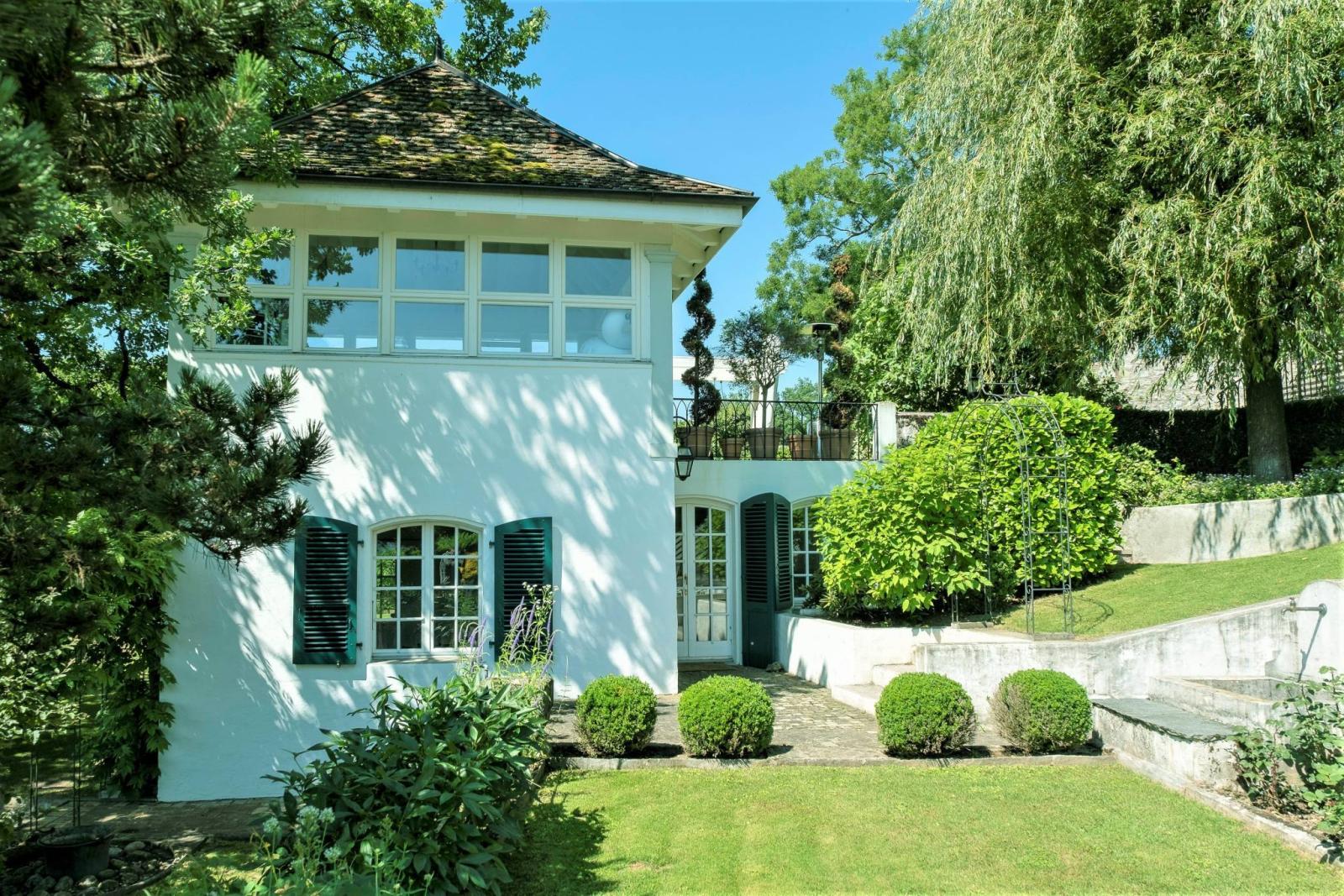 - Mitten in einem 3.700 m² großen Park gelegen, herrlich bewaldet mit wunderschönen Arten, vielen verträumten Ecken und Winkeln, einem Gewächshaus, einem Kinderspielhaus, einem Baumhaus, einem Steinsandkasten, einem Trampolin, kurzum, jedermanns Traum, ohne Sicht- à-vis und daher von seltener und kostbarer Intimität.