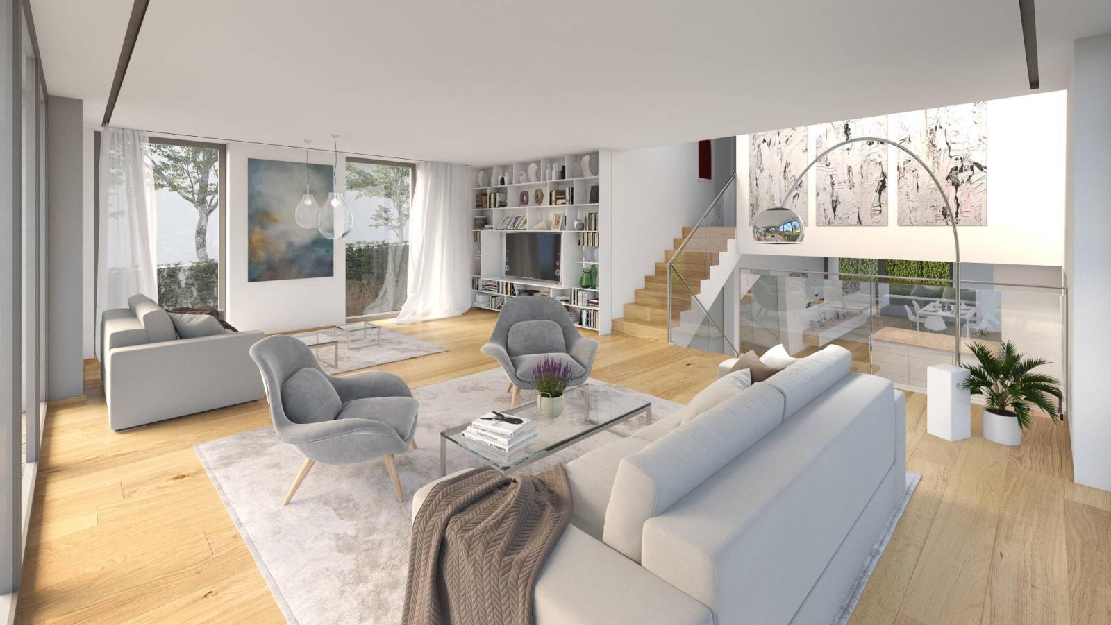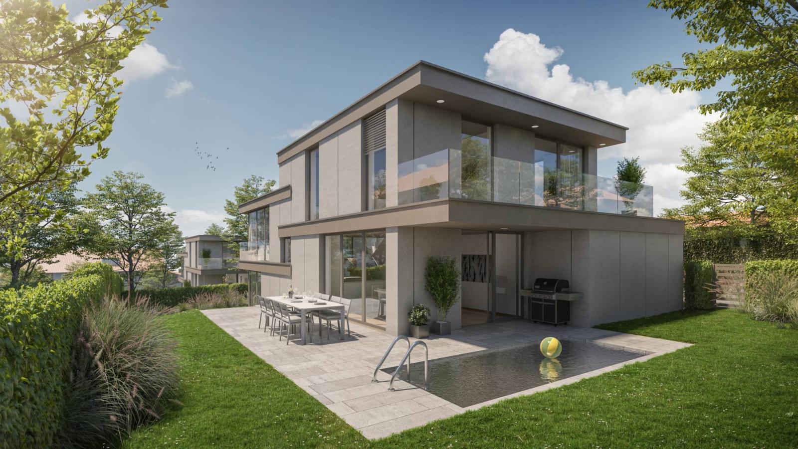 Villa B ist lichtdurchflutet, uneinsehbar und erfüllt die Anforderungen des THPE-Standards. Sie nutzt die Qualitäten der Umgebung voll aus, insbesondere dank der sehr großen Öffnungen zu Balkonen und Terrassen.