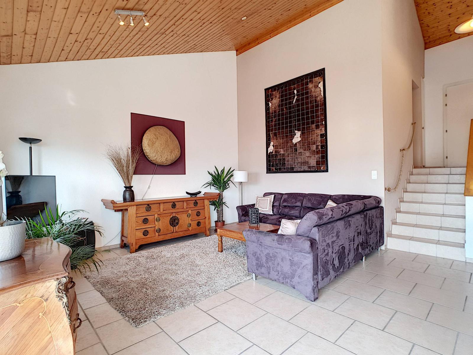 Diese auf einem wunderschönen Grundstück erbaute EPP-Villa verfügt über 6,5 Zimmer, darunter 5 Schlafzimmer, und profitiert von angenehmen Außenbereichen wie einer großzügigen Südwestterrasse, einem umzäunten Garten, einer Garage und mehreren Außenparkplätzen.