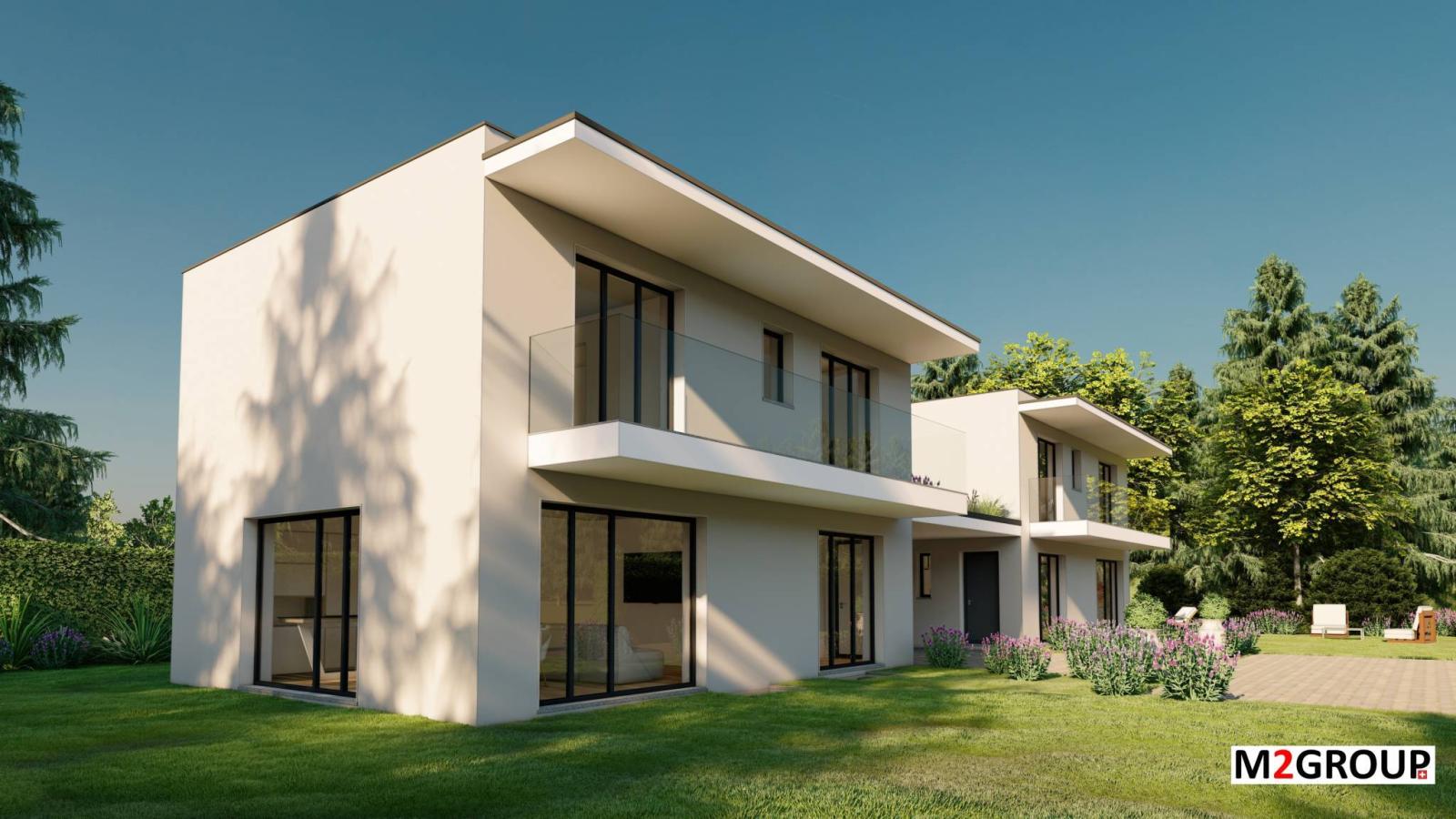 Diese wunderschönen modernen Villen sind durch einen zentralen Carport verbunden, der das Parken von zwei Fahrzeugen ermöglicht.