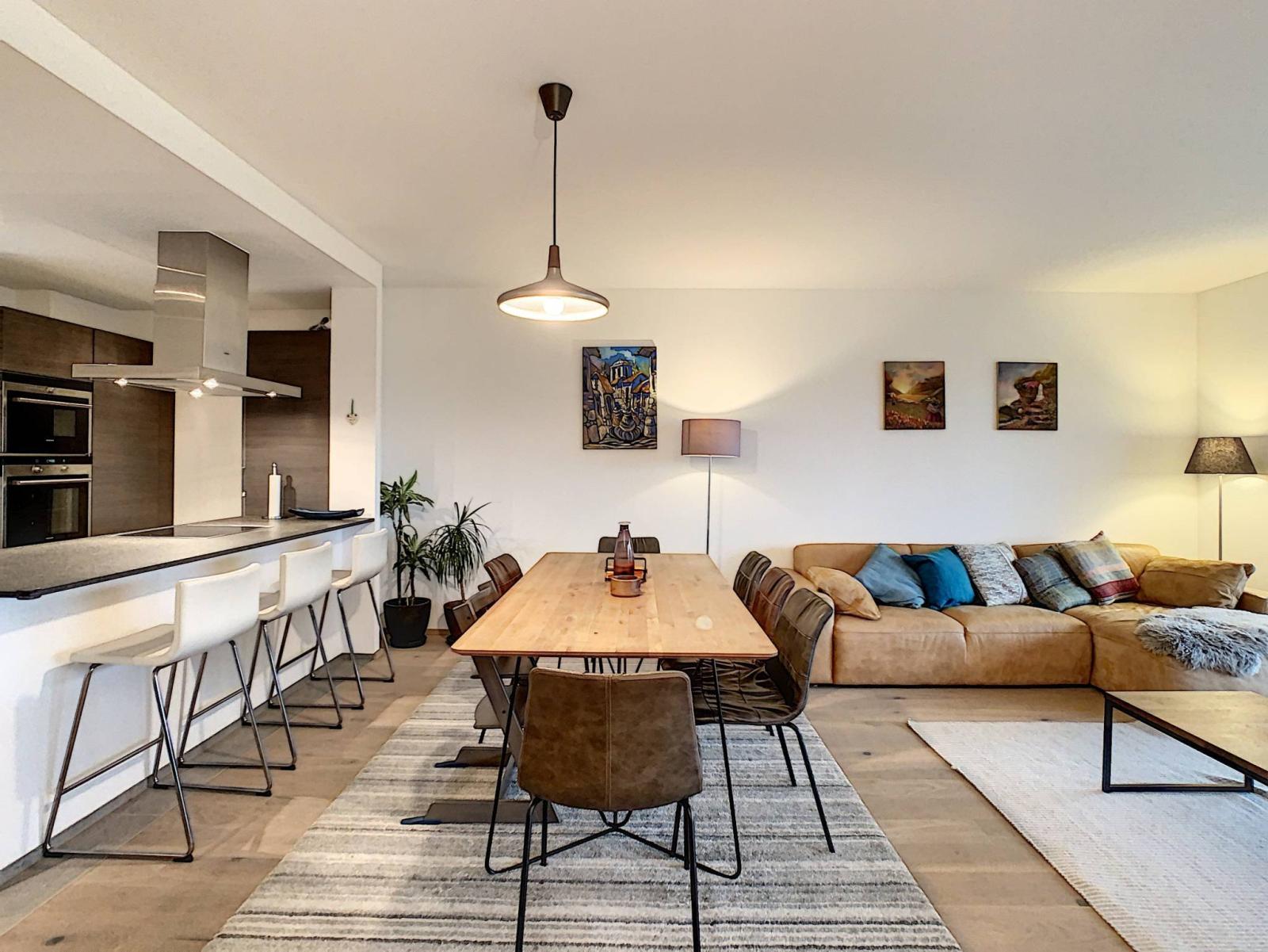 Im Tagesbereich erwartet Sie ein geräumiges und helles Wohnzimmer mit Zugang zum Ostbalkon. Die voll ausgestattete Küche ist zum Wohn- und Essbereich hin offen. Ein Schlafzimmer mit angrenzendem Duschbad und WC, ein Flur mit Wandschränken und ein Badezimmer mit WC vervollständigen diesen Raum.