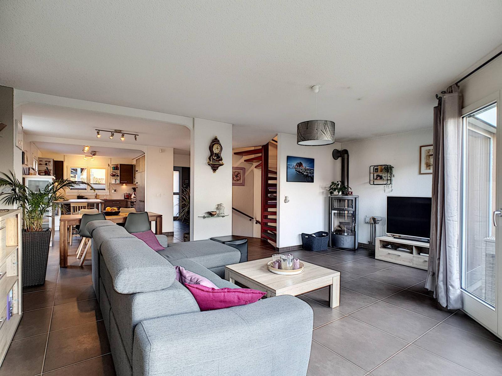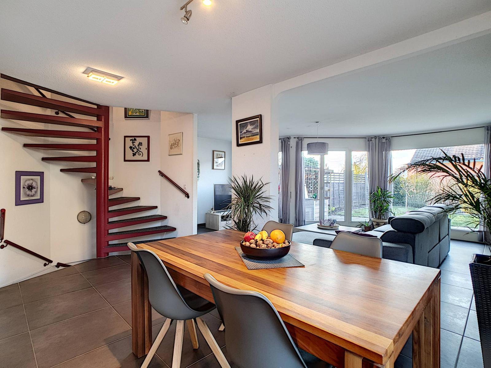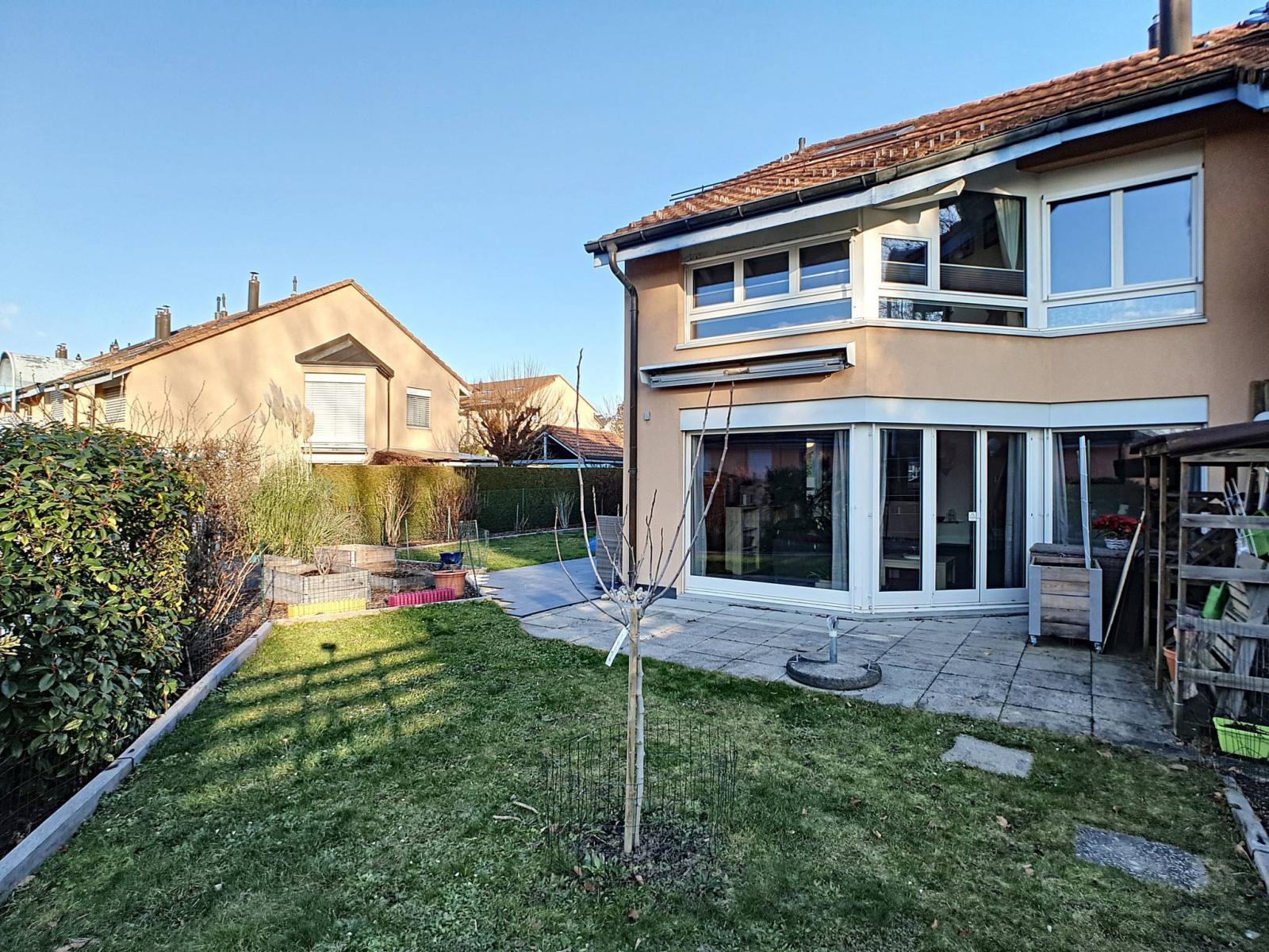 Diese Doppelhaushälfte mit 5,5 Zimmern wurde auf einem Grundstück von 354 m² erbaut und erstreckt sich über 4 Ebenen mit einem Gesamtvolumen von 673 m³. Es bietet auch einen 279 m² großen Garten, der gut angelegt ist und wenig Pflege erfordert.
