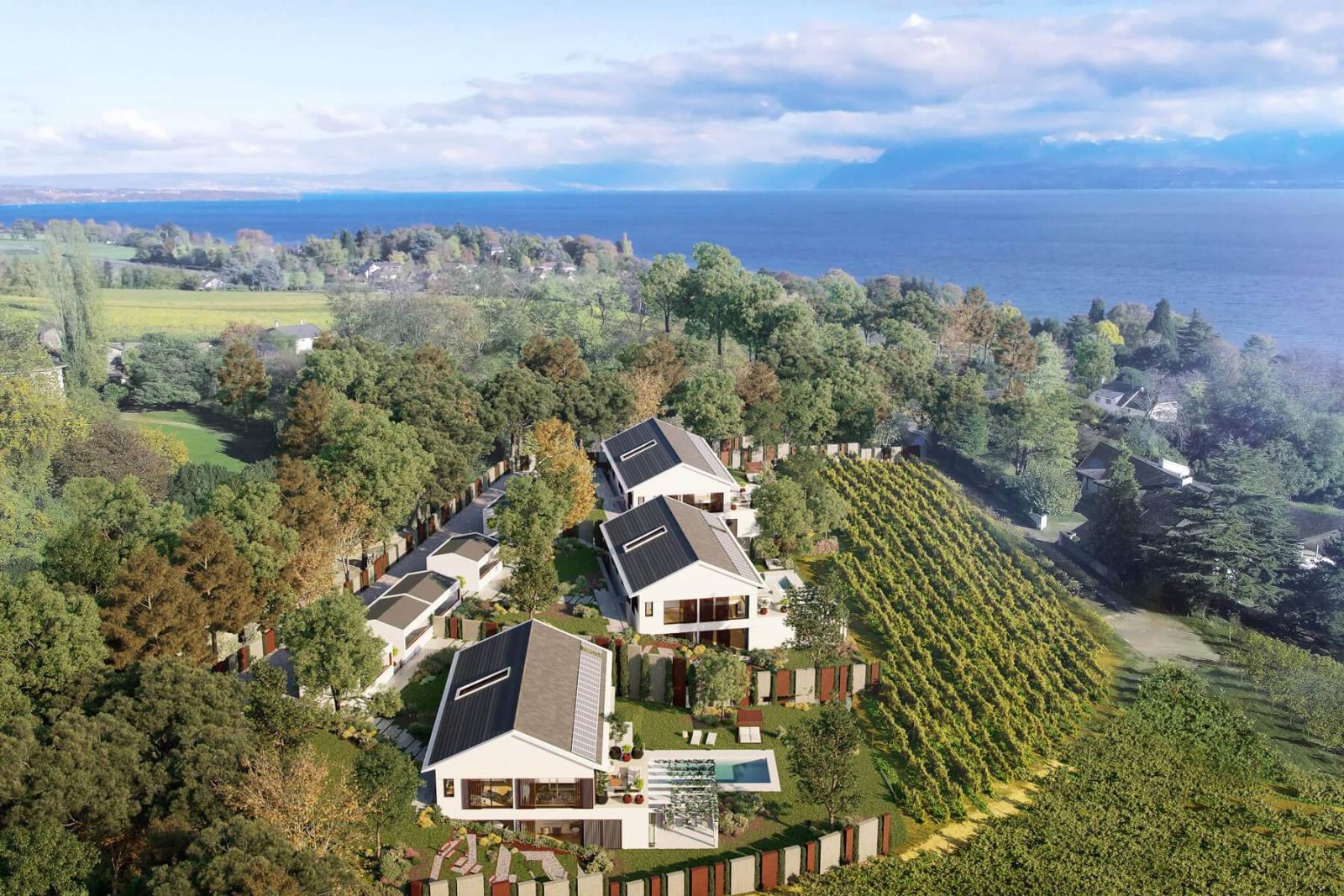 Die 3 Villen des Projekts „Le Clos des Vignes“ liegen auf einem privaten Weinberg, an einem leichten Hang, umgeben von viel Grün und bieten einen herrlichen Blick auf den See und die Berge.