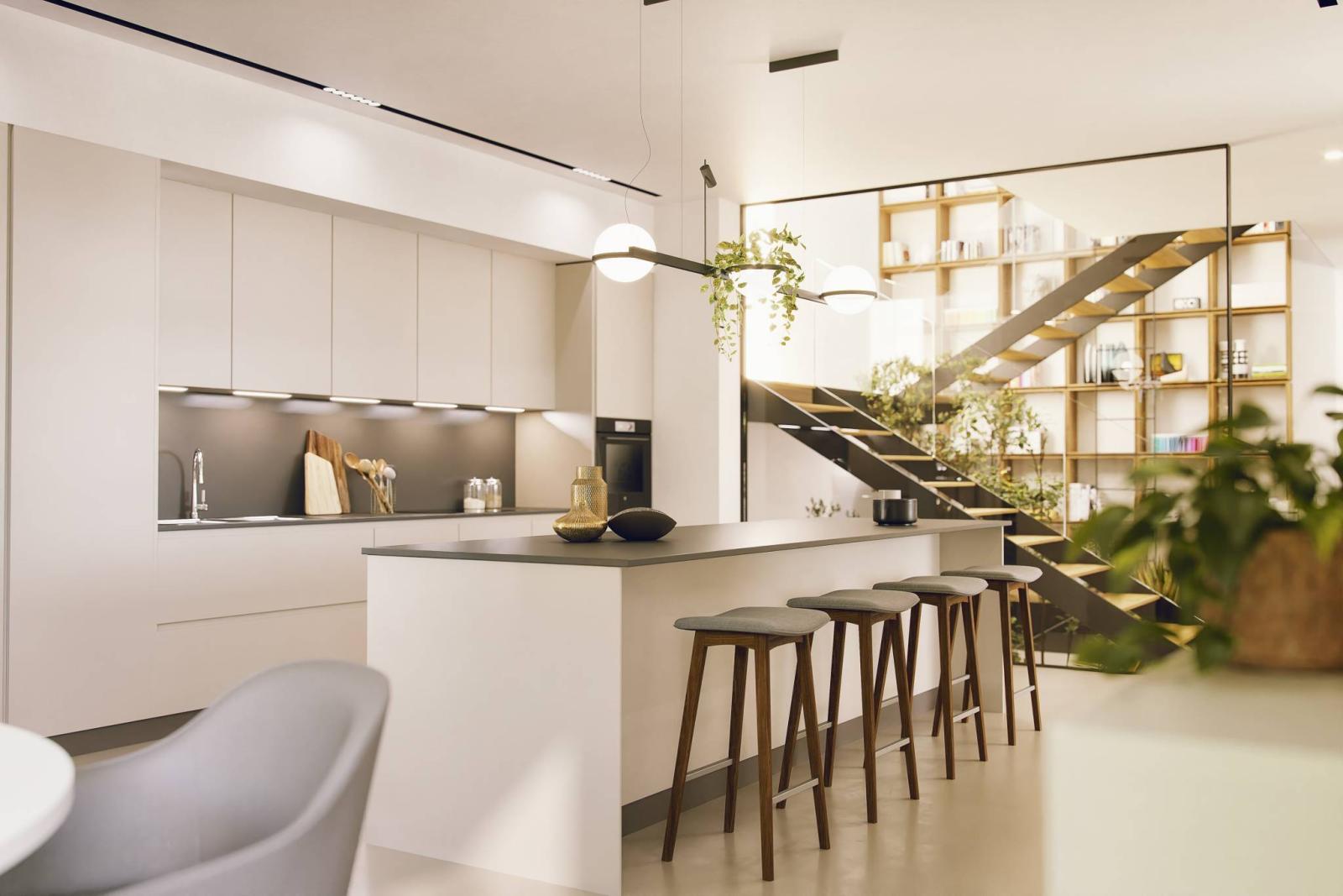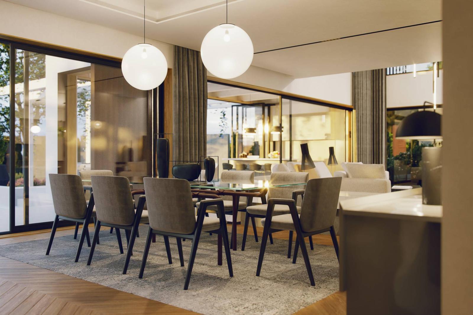 Wenn wir die Treppe hinuntergehen, finden wir das Wohnzimmer mit doppelter Höhe und das große Esszimmer, das Zugang zur Sommerküche und zum Swimmingpool bietet.