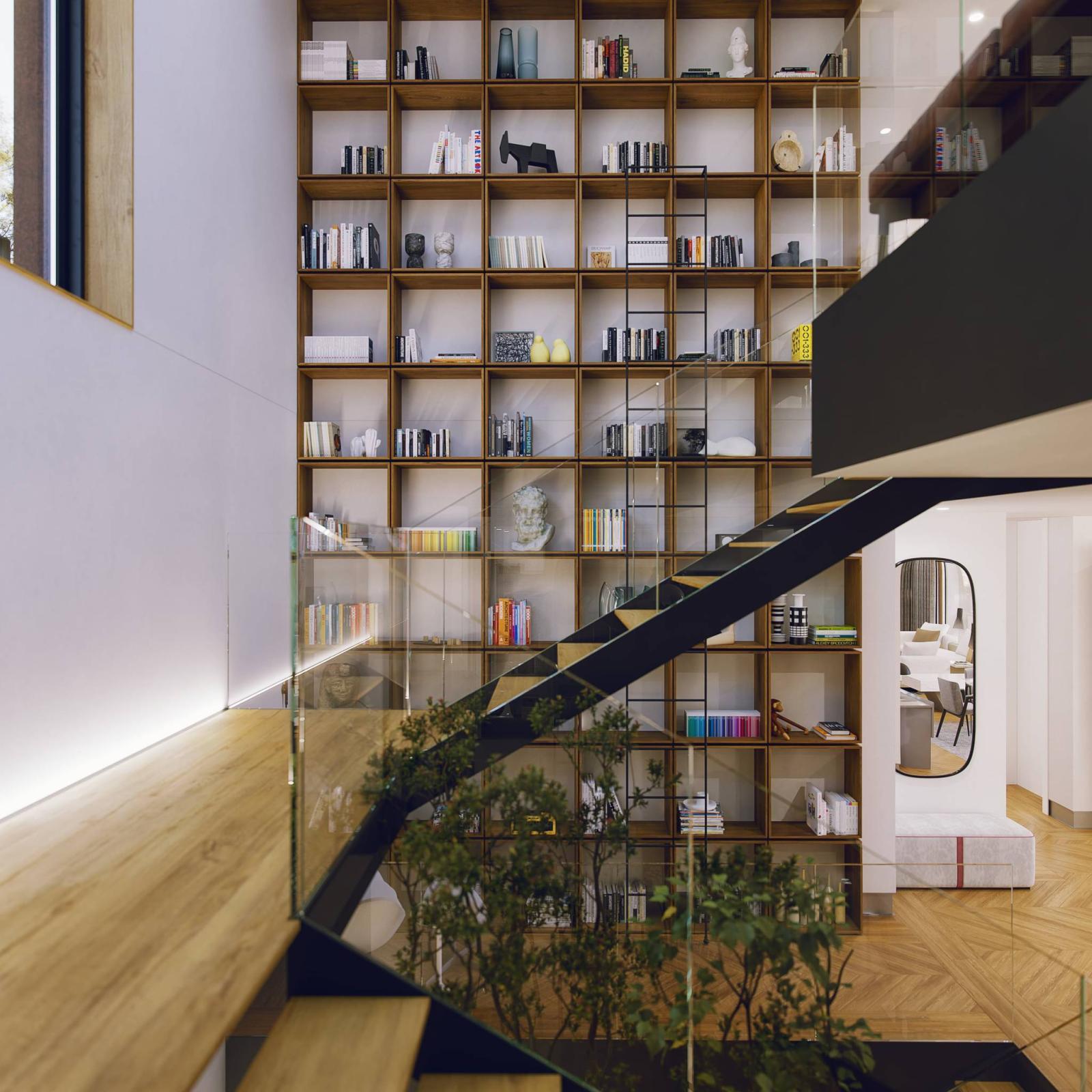 Im ersten Stock befinden sich die Schlafzimmer, jedes mit eigenem Bad, sowie ein Büro und Zugang zur Terrasse, mit privilegiertem Blick auf den See.