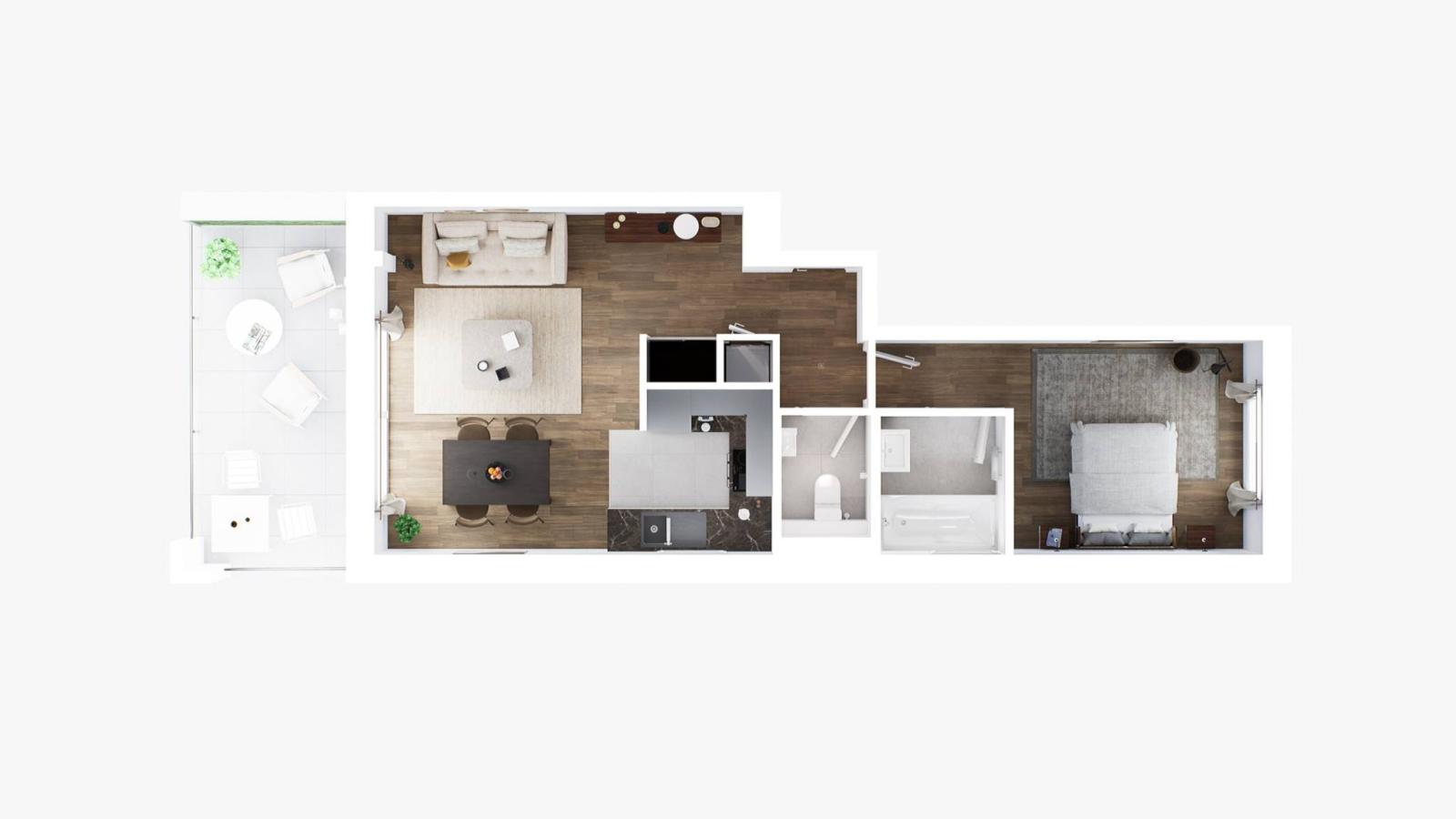 Grundstück F-302 ist eine 2,5-Zimmer-Wohnung von 63 m2 im 3. Stock, mit einem Balkon von 13 m2, aufgeteilt wie folgt: