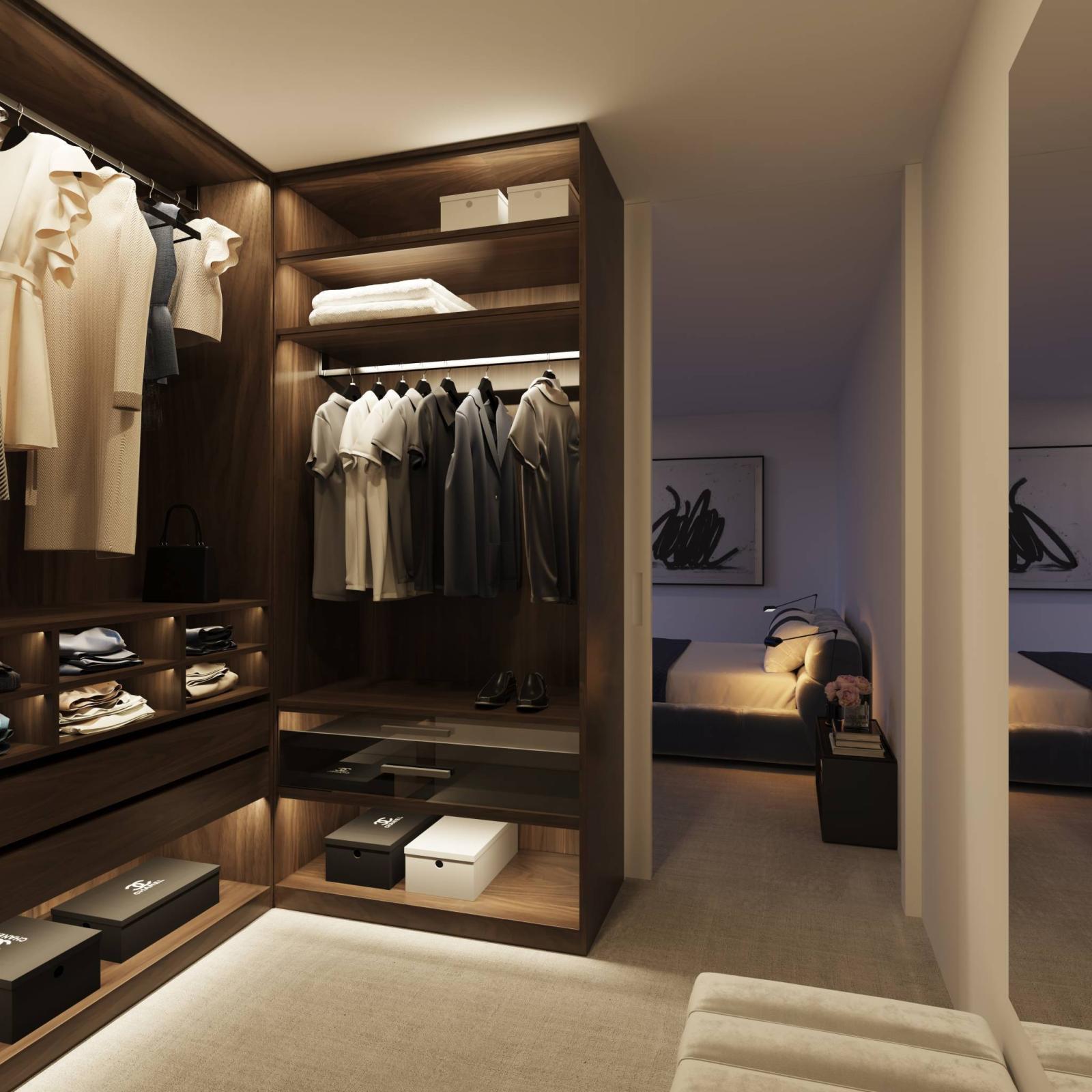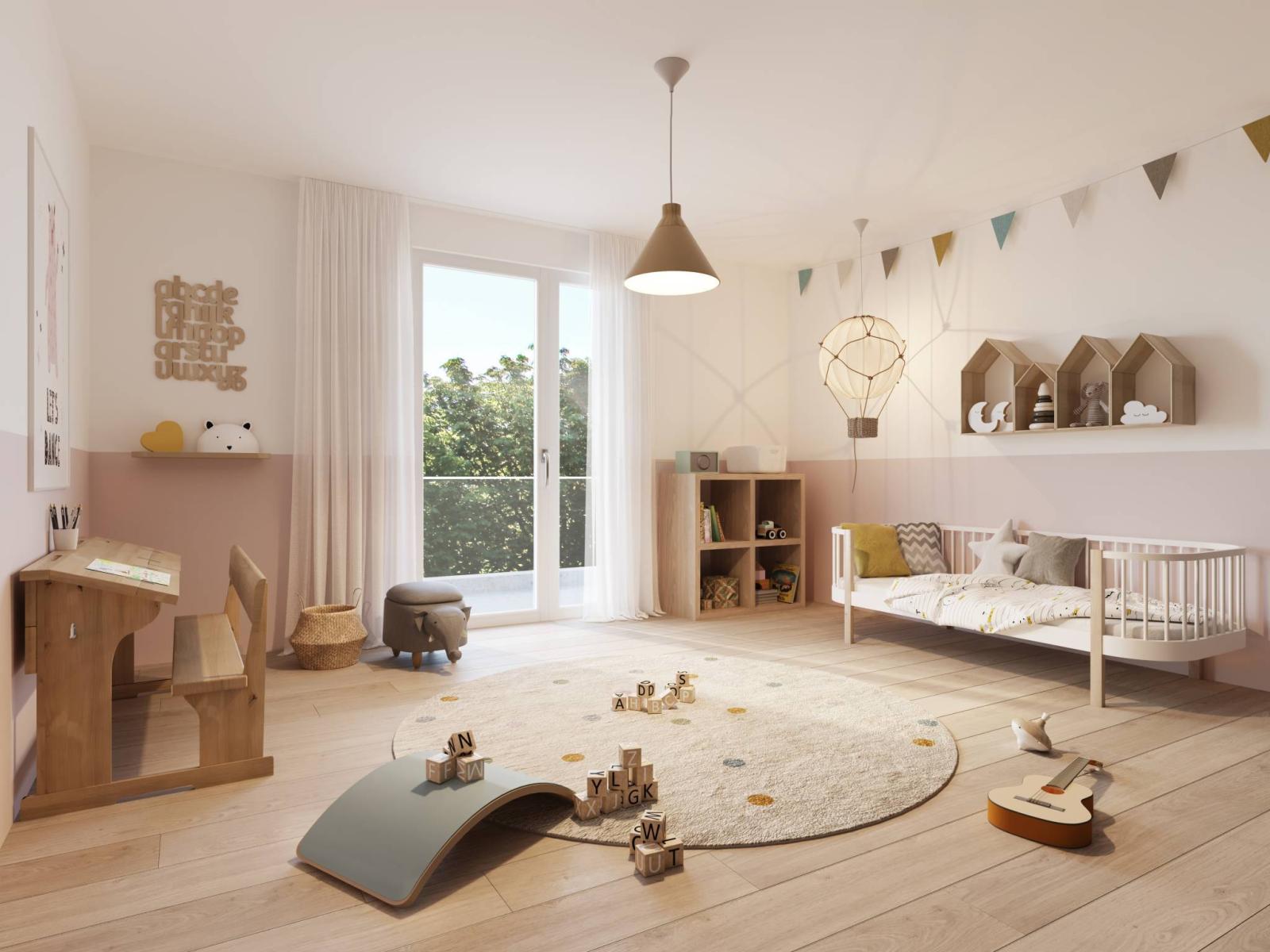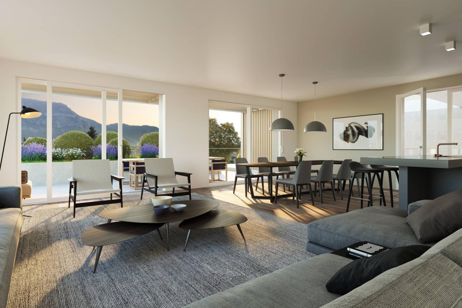 Helles Wohnzimmer mit direktem Zugang zur Terrasse. Eine Mastersuite mit Ankleidezimmer und angrenzendem Duschbad/WC und Zugang zur Terrasse. 3 geräumige Kinderzimmer und Zugang zur Terrasse