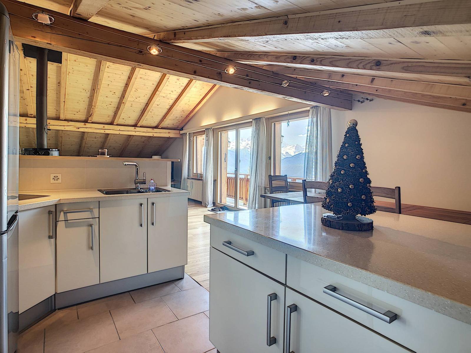 Diese sehr schöne Wohnung im Dachgeschoss befindet sich in einer kleinen Residenz östlich von Crans-Montana, nicht weit von den Abfahrten der Violettes-Hütten und dem Zentrum von Montana entfernt. Es genießt einen wunderschönen Blick auf die Alpen. Hell, freundlich und in ausgezeichnetem Allgemeinzustand ist diese Wohnung ideal für einen Aufenthalt im Haut-Plateau.