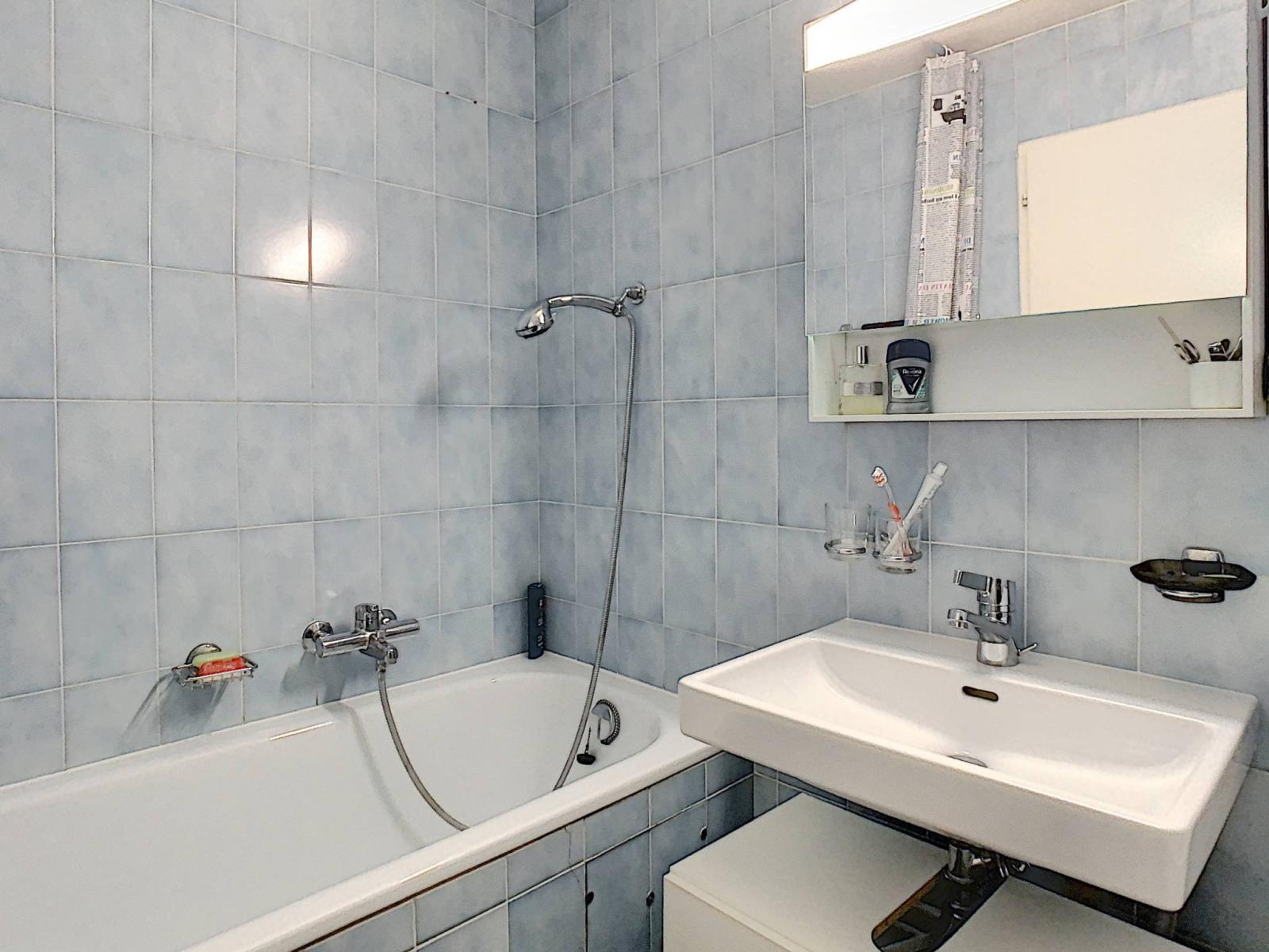 Der Tagesbereich umfasst eine Eingangshalle, ein großes Wohnzimmer mit Kamin, das sich auf eine überdachte Terrasse und den Garten öffnet, eine geschlossene Küche mit Essbereich und ein Duschbad, das als Gäste-WC dient.