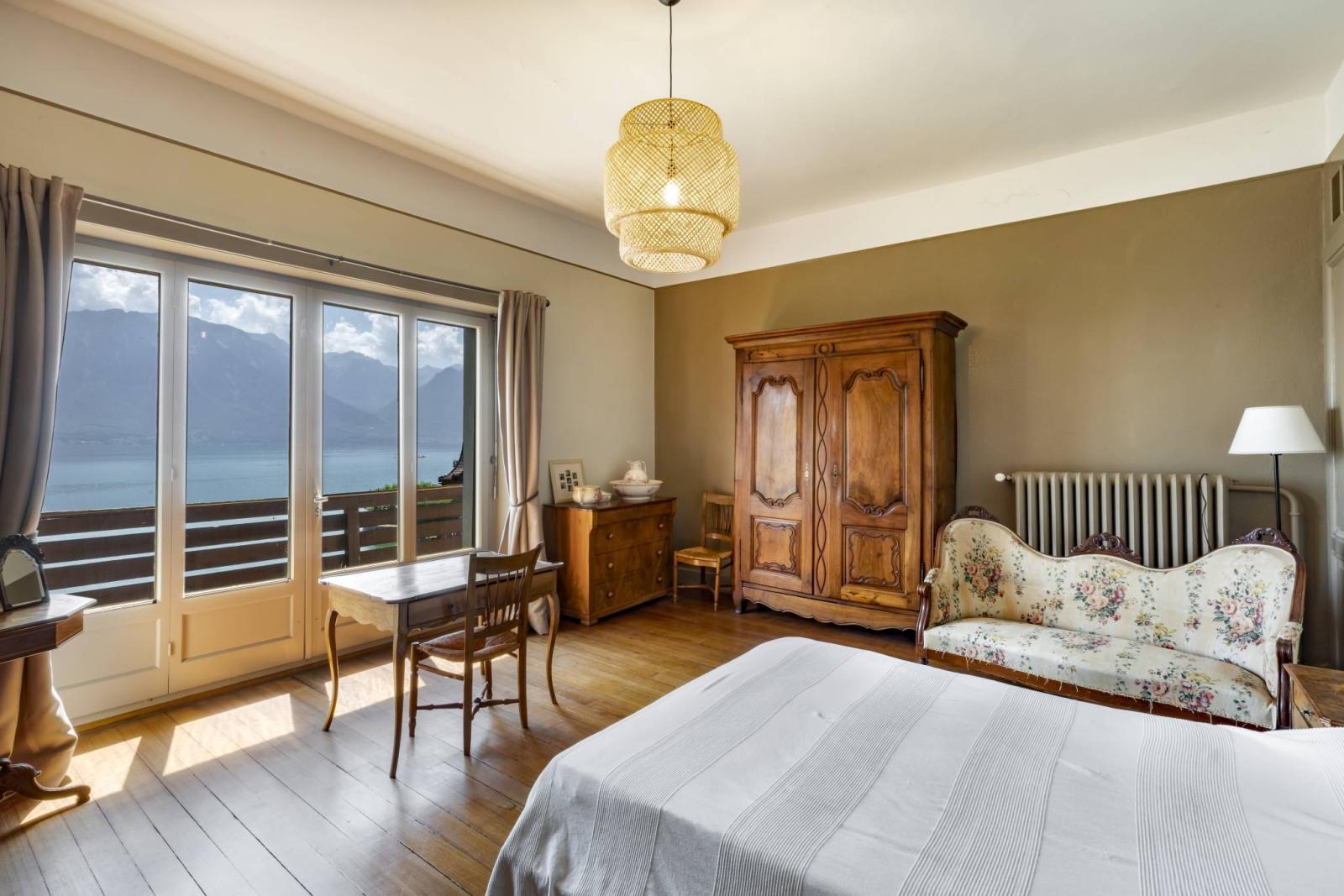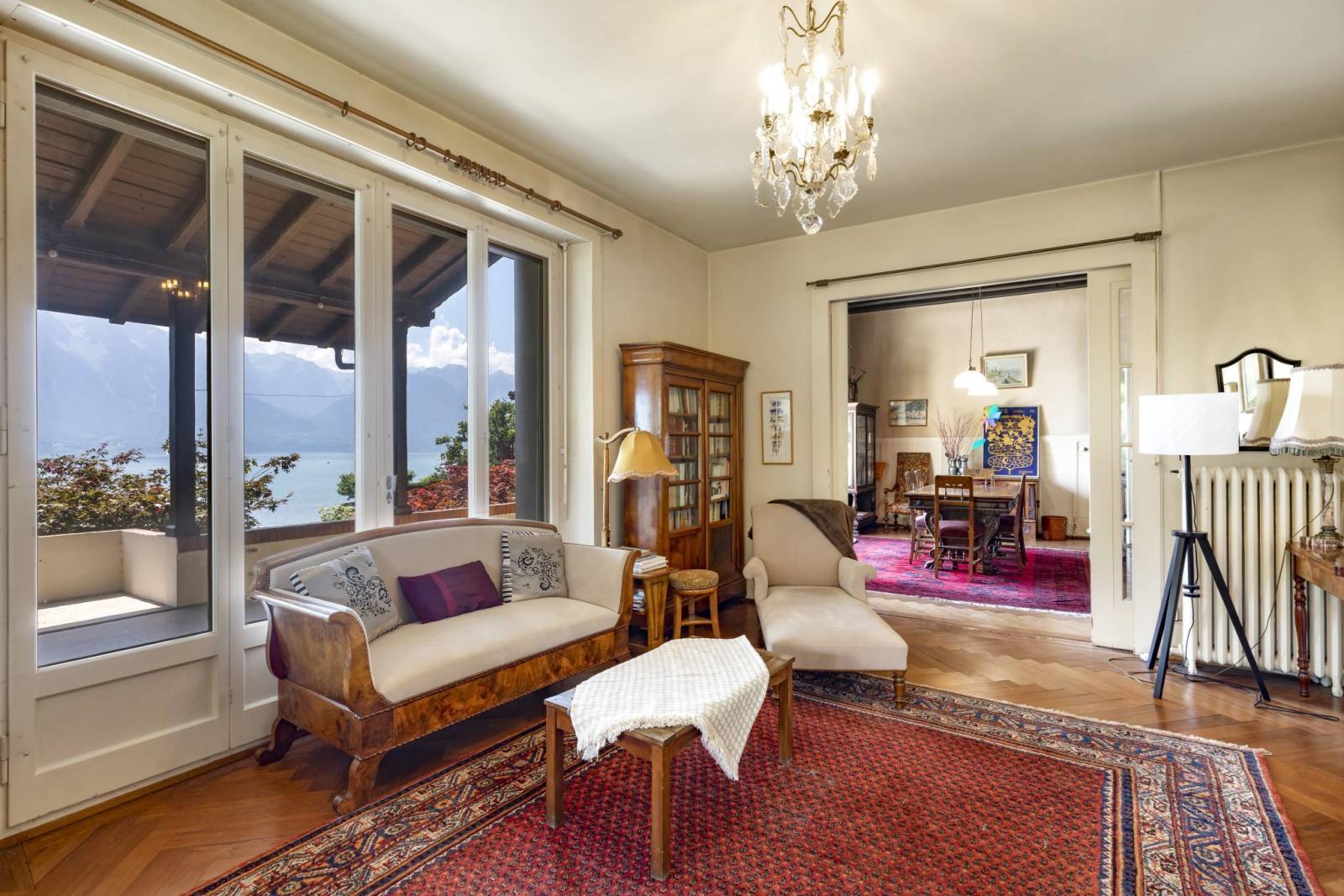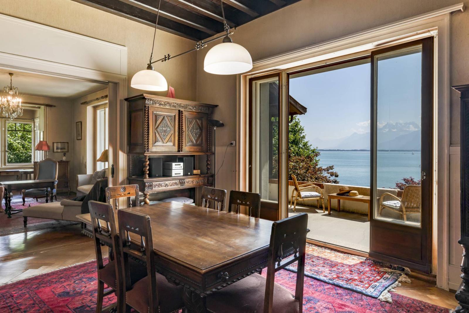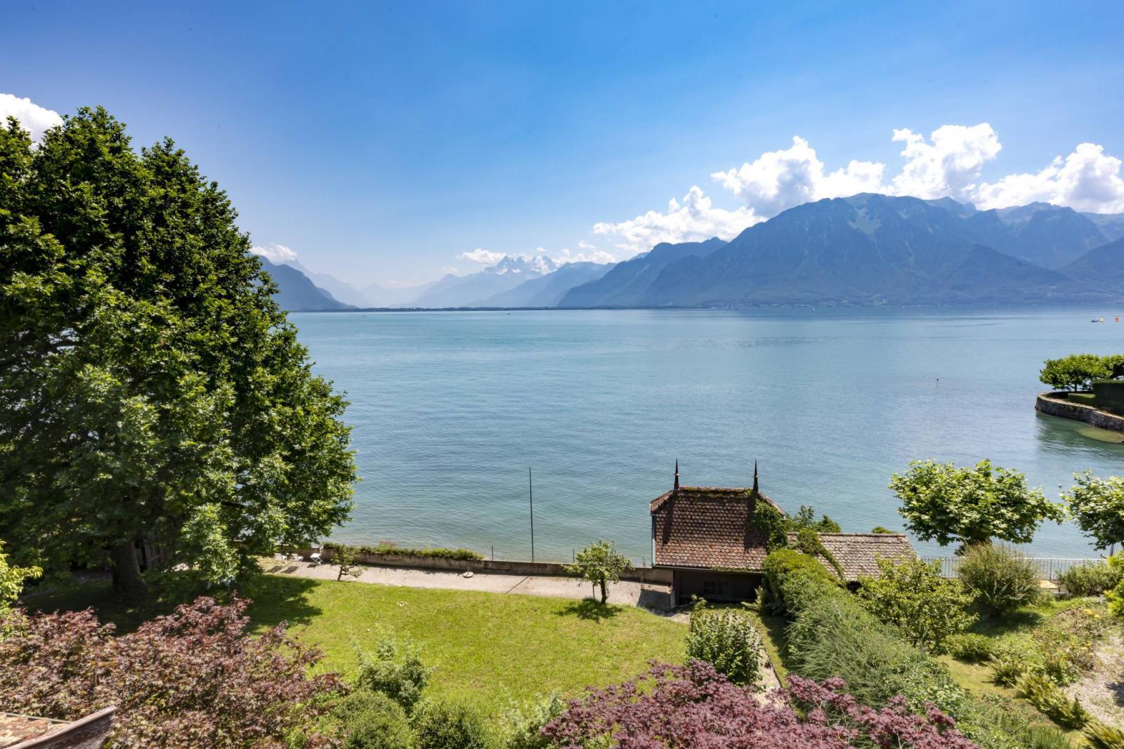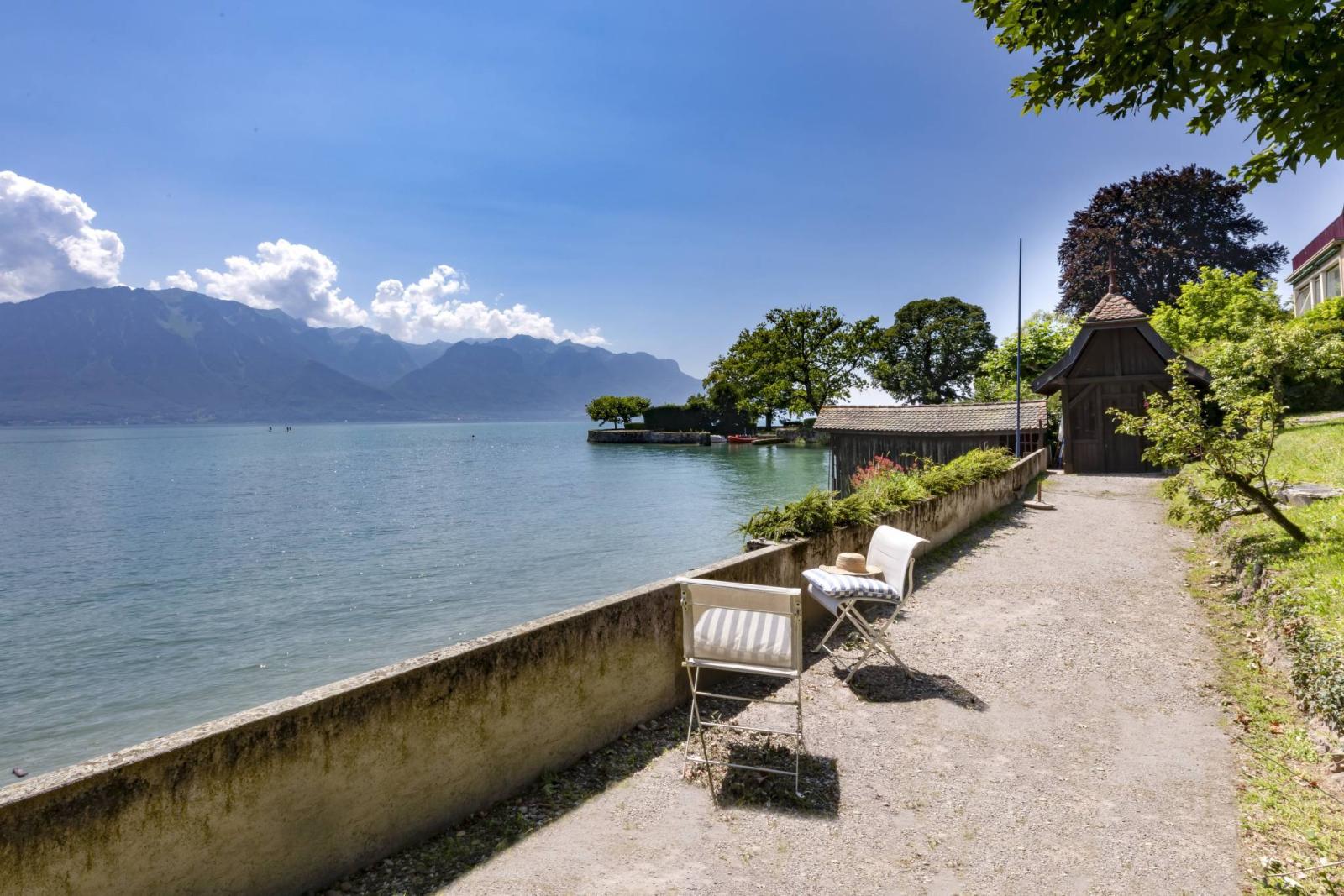 Dieses seltene Anwesen mit 14 Zimmern liegt direkt am Wasser und bietet einen herrlichen Blick auf den Genfersee und die Berge. Es erstreckt sich über drei Ebenen sowie einen Keller.