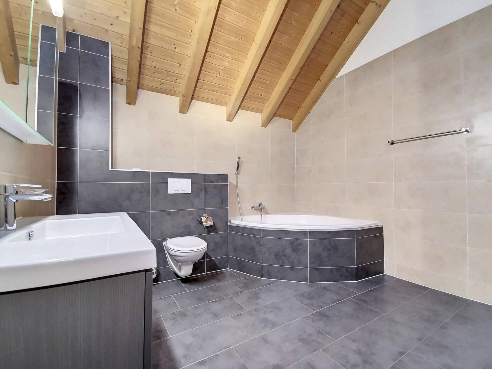 Dachgeschoss: - Ein geräumiges Schlafzimmer/Ankleidezimmer; - Ein großes Badezimmer/Dusche/WC (Eckbadewanne und italienische Dusche).