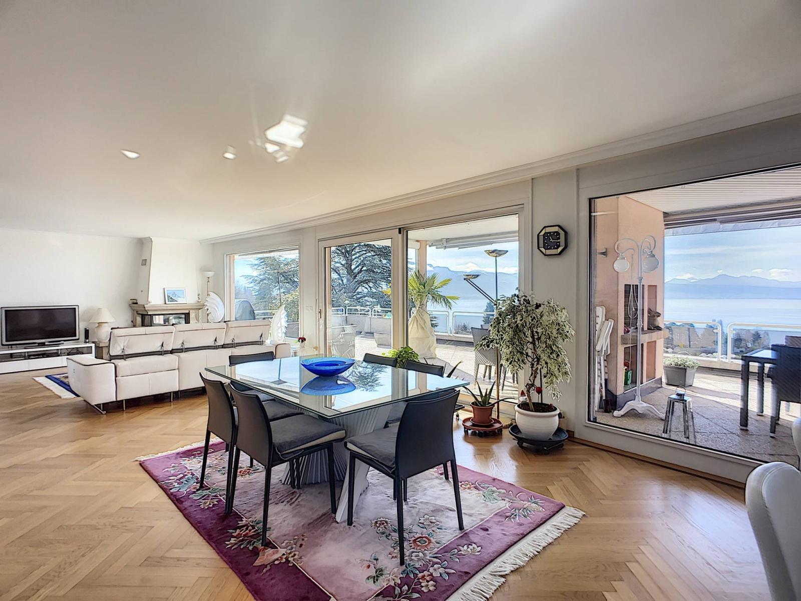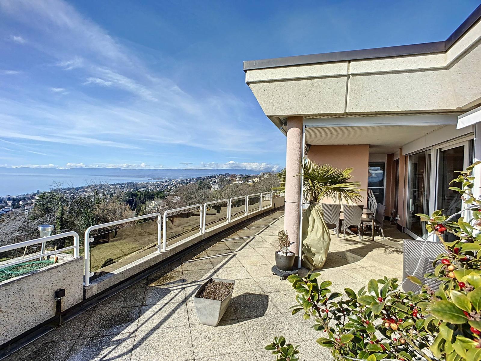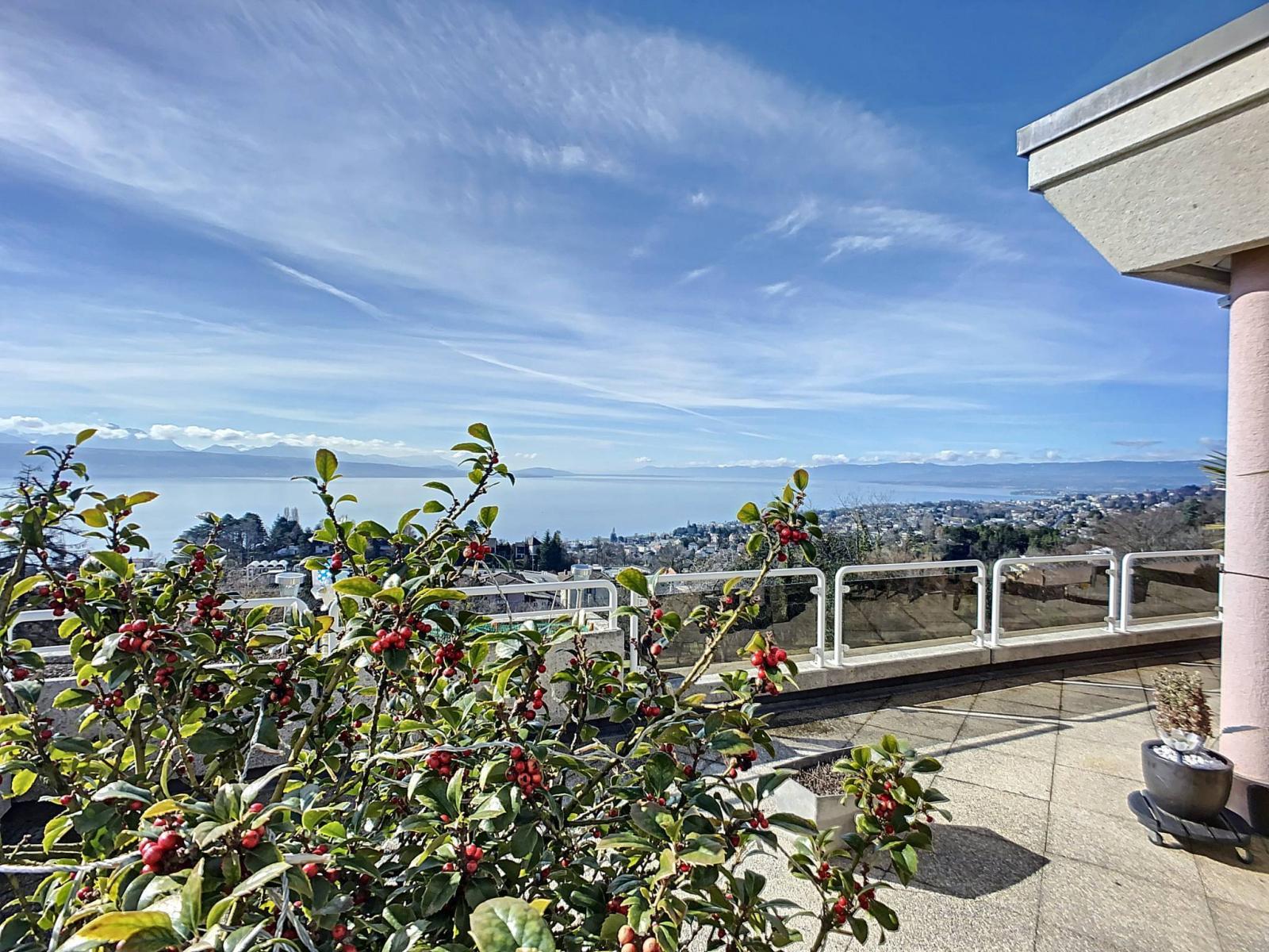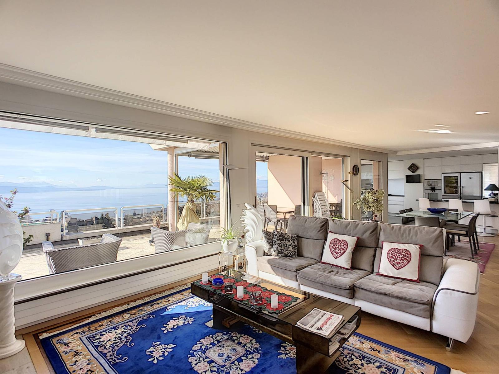 Diese prächtige 5 ½-Zimmer-Penthouse-Wohnung mit einer sehr großen Terrasse befindet sich im Ost-Süd-West-Bereich der Luxusresidenz Haute Vue in La Conversion sur Lutry.