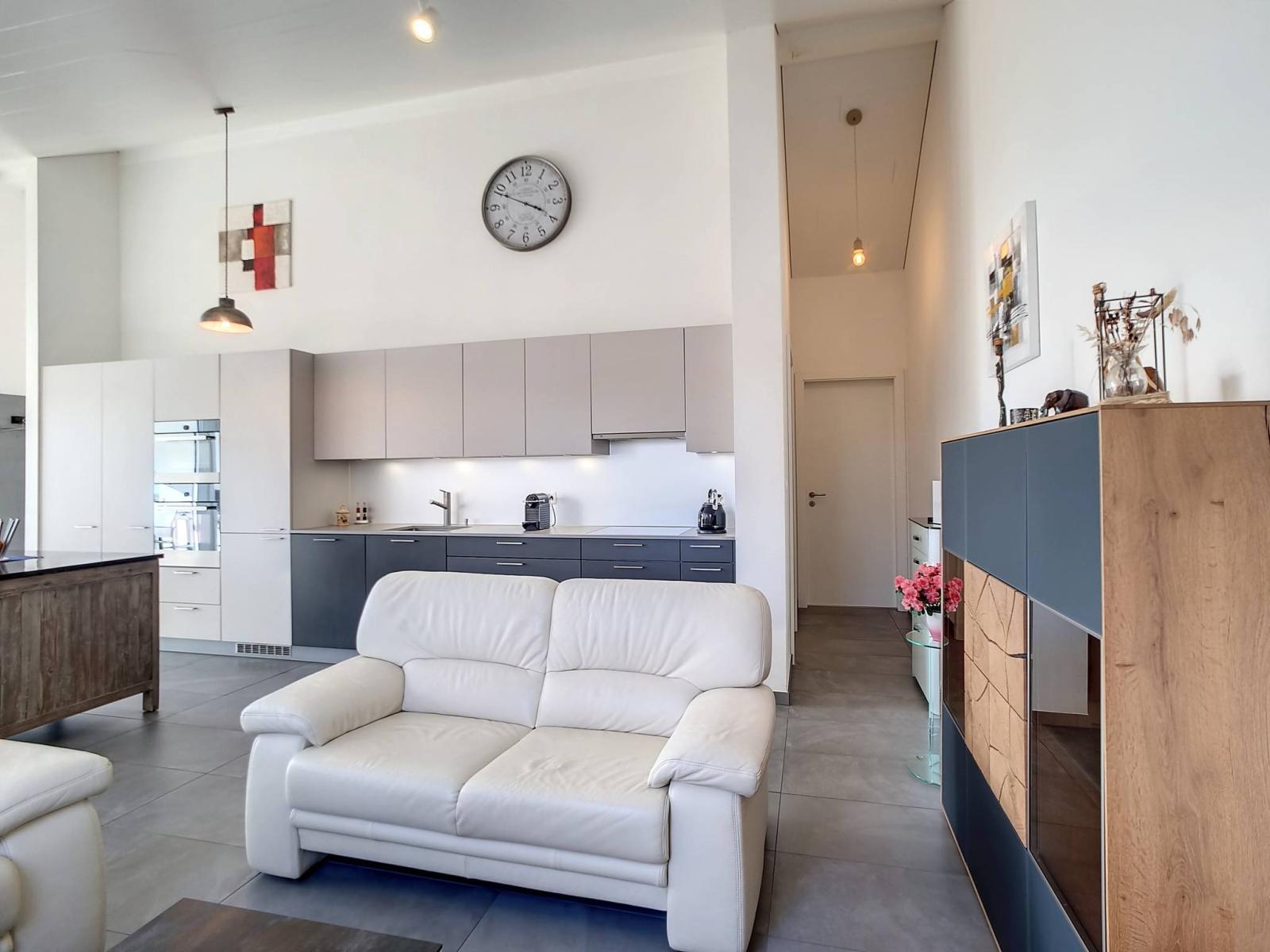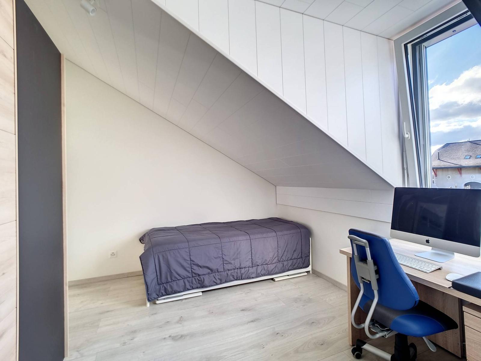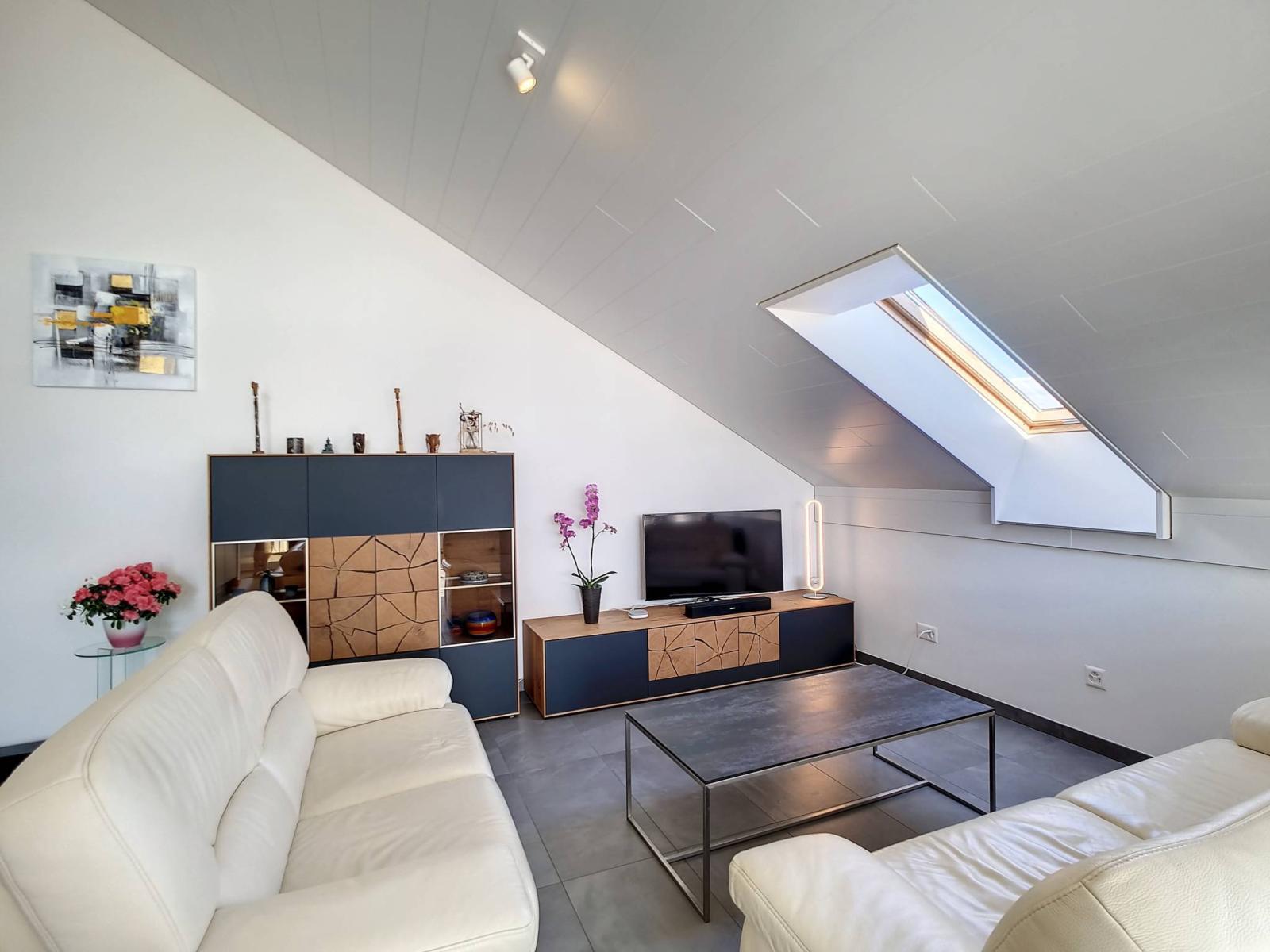 Diese gut ausgestattete 3,5-Zimmer-Wohnung auf einer Ebene und im Dachgeschoss verfügt über 2 Schlafzimmer, ein Badezimmer/WC und ein Duschbad/WC sowie einen geräumigen „modernen“ Haupt- und Lieblingsraum (Wohn-/Esszimmer). Zimmer / voll ausgestattete Küche) von 46,30 m² und einer schönen Höhe unter dem First, die den Dachboden gemütlich und nicht einschränkend macht. Die Wand der Eingangshalle wurde hübsch mit Wachsbeton gestaltet.