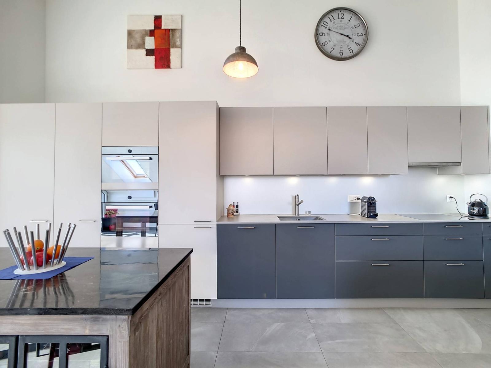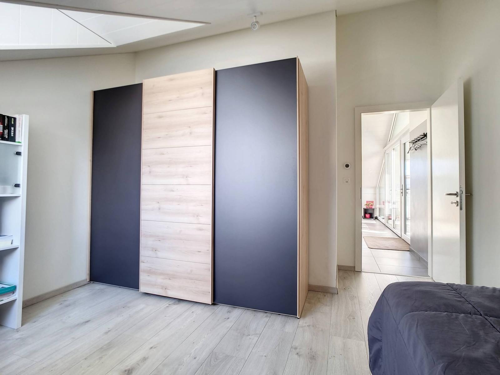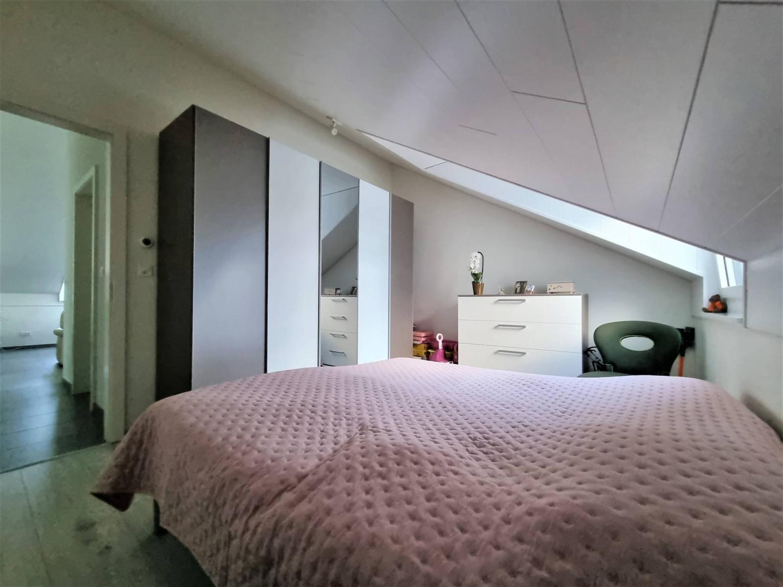Diese gut ausgestattete 3,5-Zimmer-Wohnung auf einer Ebene und im Dachgeschoss verfügt über 2 Schlafzimmer, ein Badezimmer/WC und ein Duschbad/WC sowie einen geräumigen „modernen“ Haupt- und Lieblingsraum (Wohn-/Esszimmer). Zimmer / voll ausgestattete Küche) von 46,30 m² und einer schönen Höhe unter dem First, die den Dachboden gemütlich und nicht einschränkend macht. Die Wand der Eingangshalle wurde hübsch mit Wachsbeton gestaltet.
