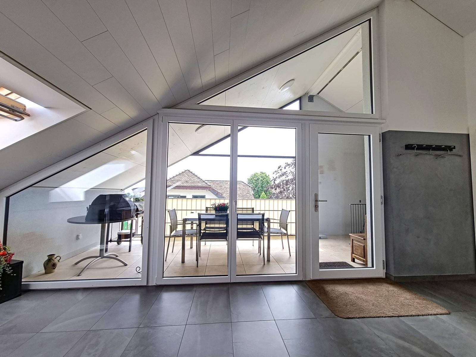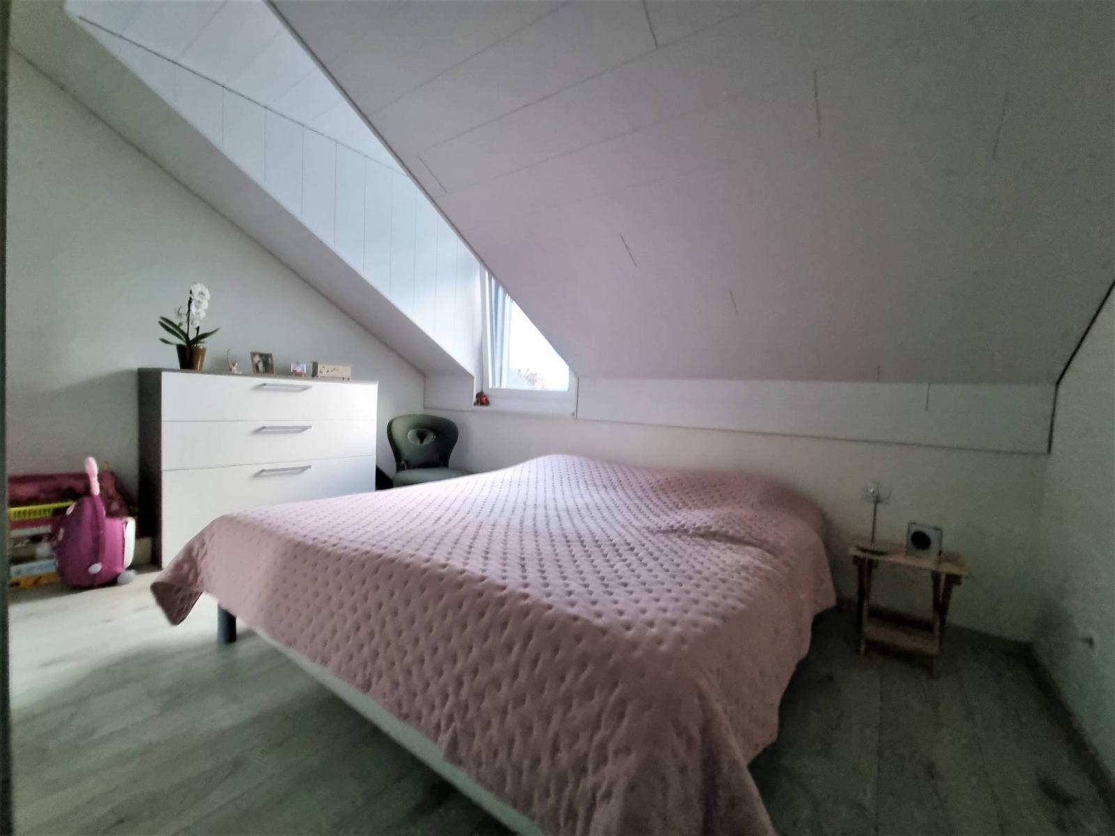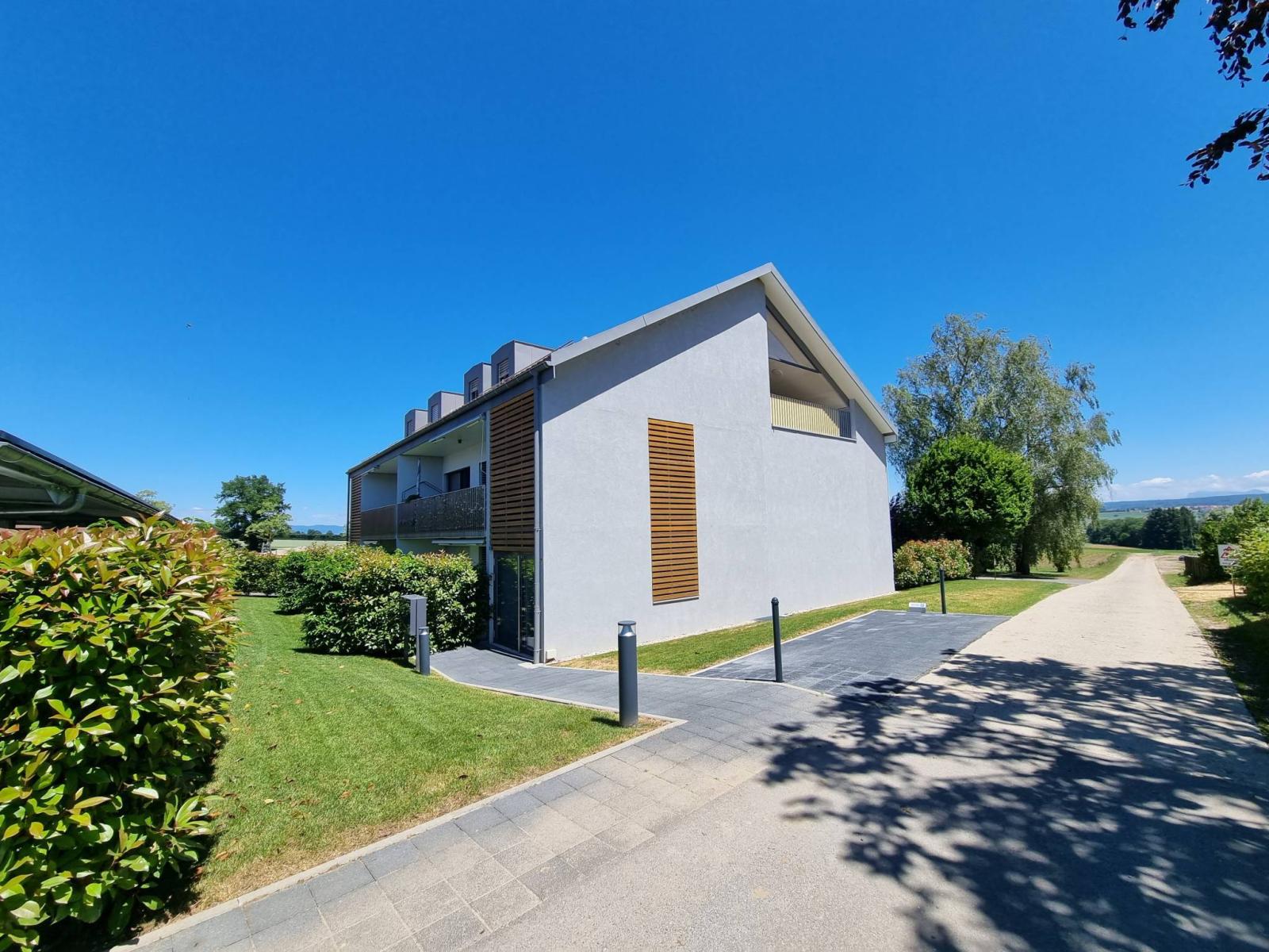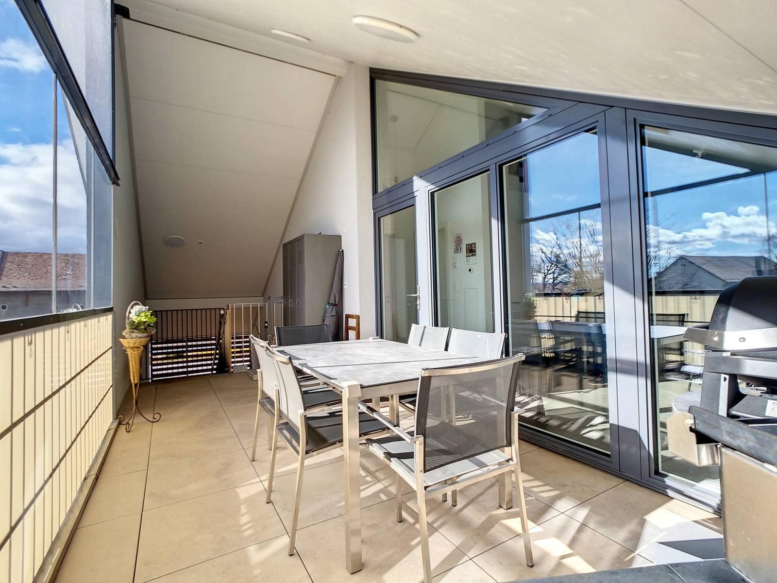 Innerhalb eines menschengroßen Gebäudes mit 2 Etagen (Grundstück im obersten Stockwerk = ohne Aufzug), das 2017 erbaut wurde, besteht die PPE aus 2 kleinen Gebäuden mit 6 und 8 Grundstücken. Die Wohnung befindet sich im Dachgeschoss und verfügt über einen großen überdachten Balkon (offene Loggia) von fast 19 m²! Dieser ist so organisiert, dass er durch abnehmbare Verglasungen „offen“ oder „halbgeschlossen“ bleiben kann, um das ganze Jahr über davon zu profitieren.