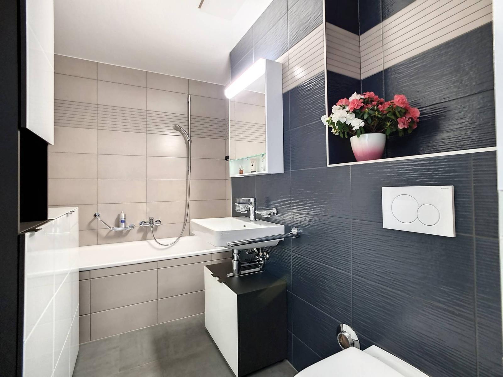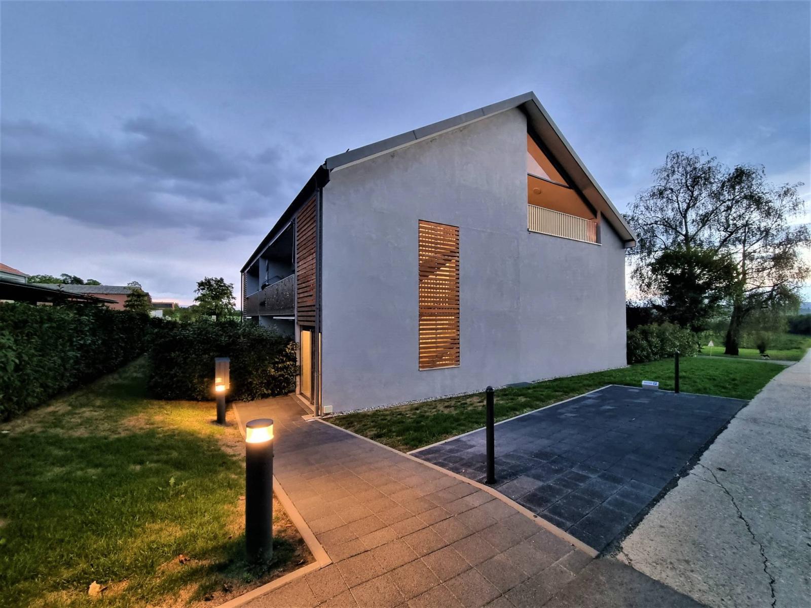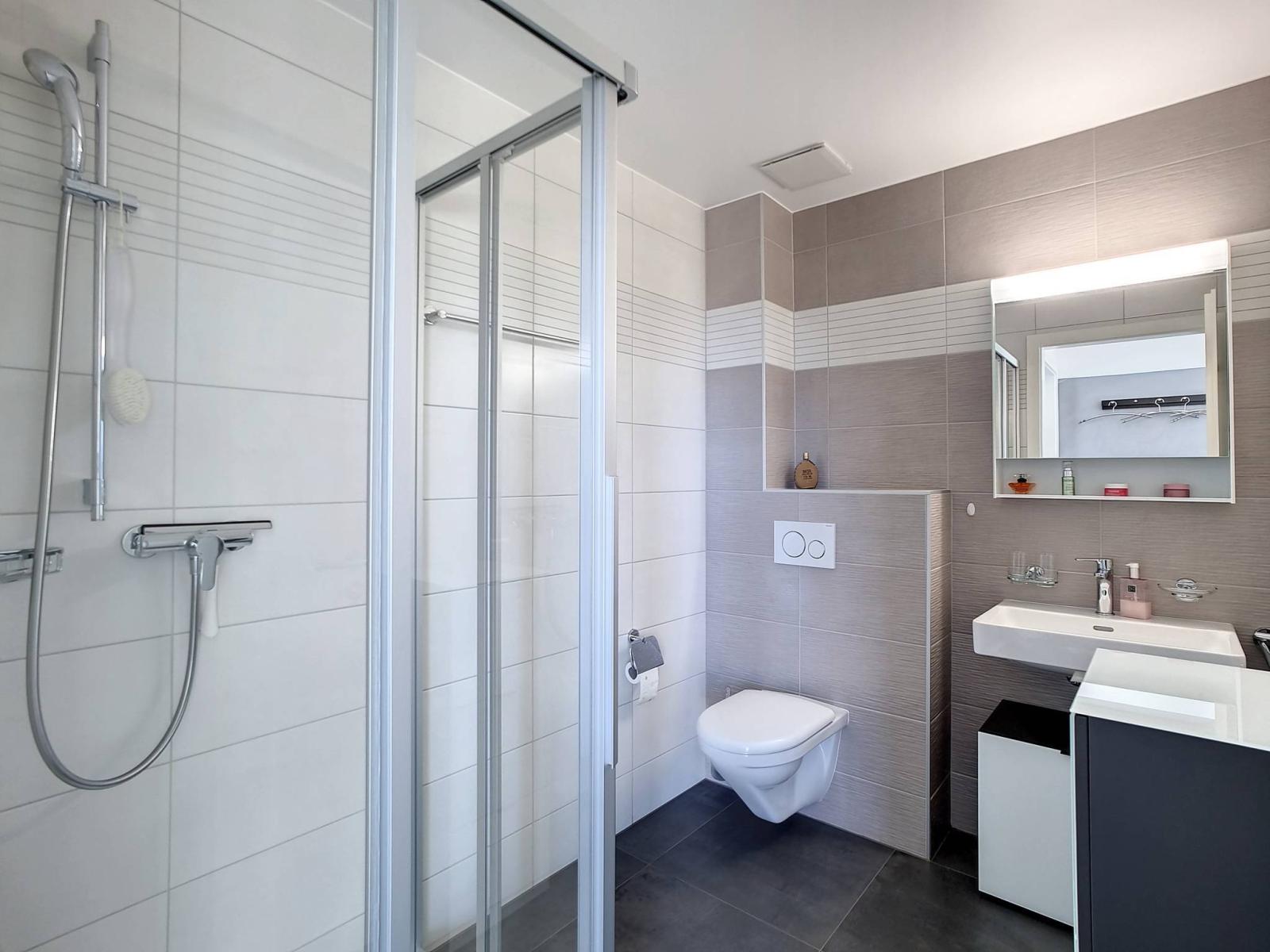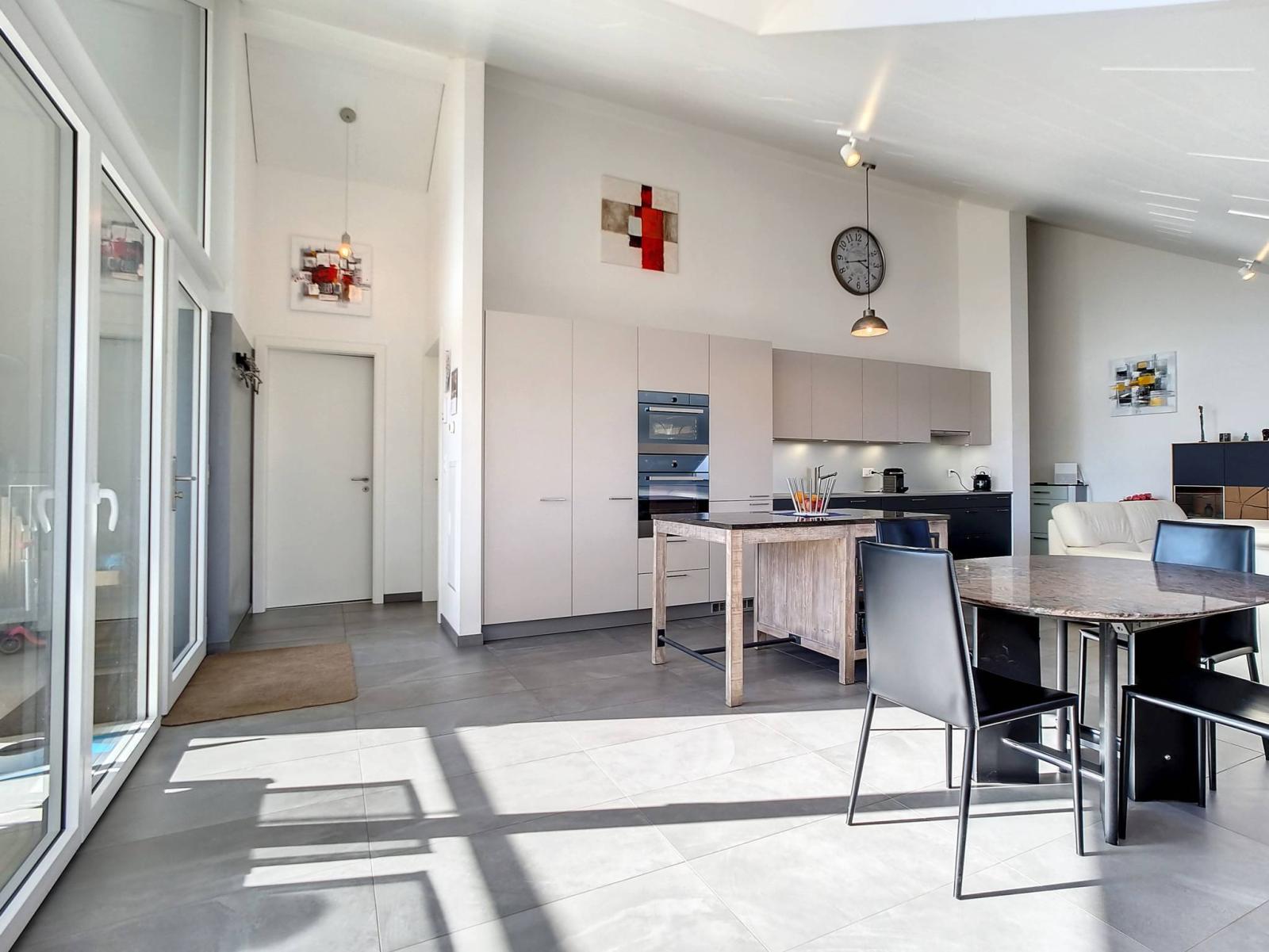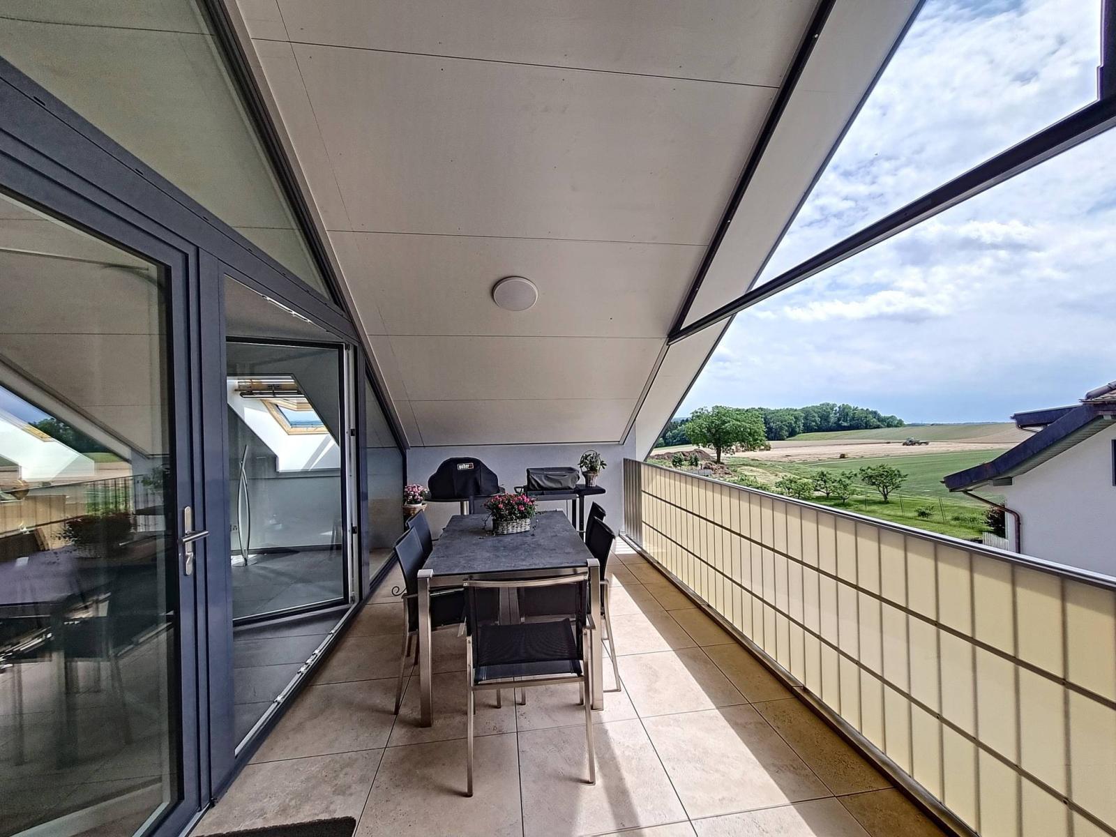 Innerhalb eines menschengroßen Gebäudes mit 2 Etagen (Grundstück im obersten Stockwerk = ohne Aufzug), das 2017 erbaut wurde, besteht die PPE aus 2 kleinen Gebäuden mit 6 und 8 Grundstücken. Die Wohnung befindet sich im Dachgeschoss und verfügt über einen großen überdachten Balkon (offene Loggia) von fast 19 m²! Dieser ist so organisiert, dass er durch abnehmbare Verglasungen „offen“ oder „halbgeschlossen“ bleiben kann, um das ganze Jahr über davon zu profitieren.