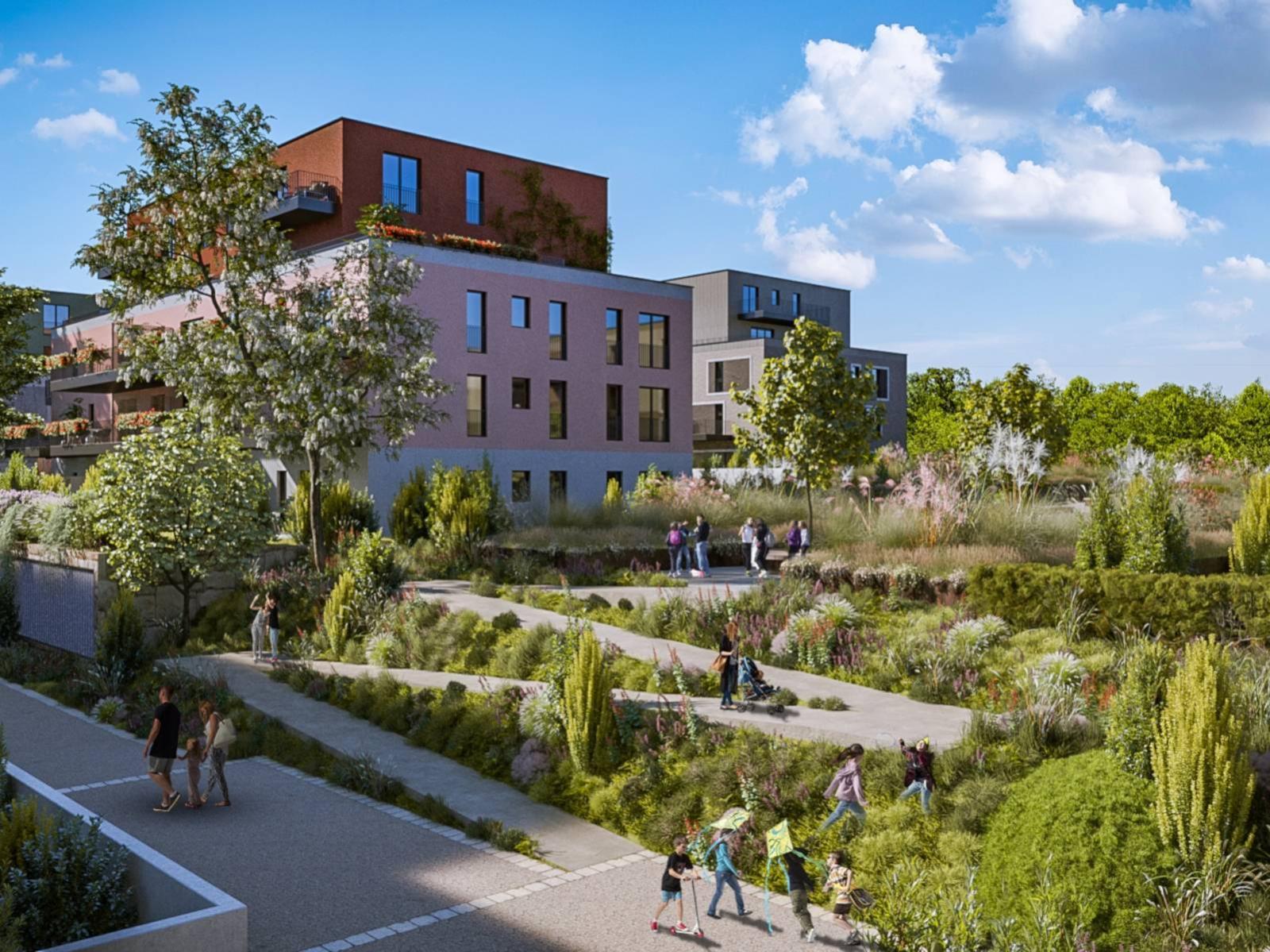Ihre Vorteile: - Moderner und hochwertiger Innenausbau, Ausführung nach Wahl des Mieters - Privatgärten, Terrassen oder große Balkone - Abfolge von Räumen in grasbewachsenen und baumbestandenen Ebenen - Spielbereich aus Holz - Grundstück vollständig über Wege und Rampen zugänglich - Oberfläche Besucherparkplätze - Tiefgarage für Autos, Motorräder und Fahrräder
