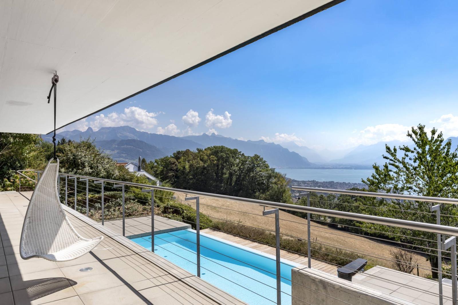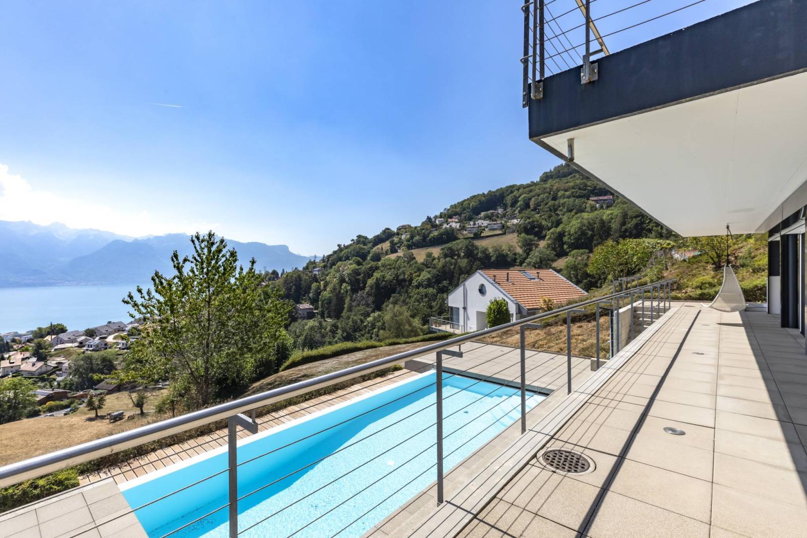 Diese freistehende 6-Zimmer-Villa mit ca. 195 m² Wohnfläche wurde auf einem 700 m² großen Grundstück erbaut und bietet einen herrlichen Blick auf den Genfersee und die Berge mit optimaler Sonneneinstrahlung. Darüber hinaus verfügt es über zwei Terrassen, einen kleinen Gartenbereich, einen Balkon und einen großen, mit einer Wärmepumpe beheizten Außenpool.