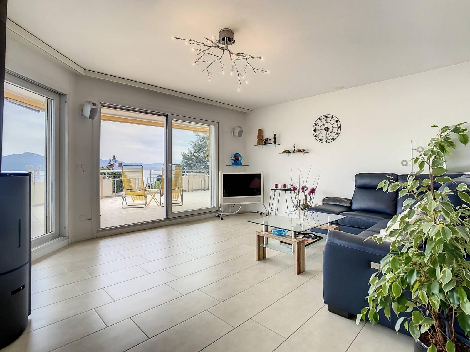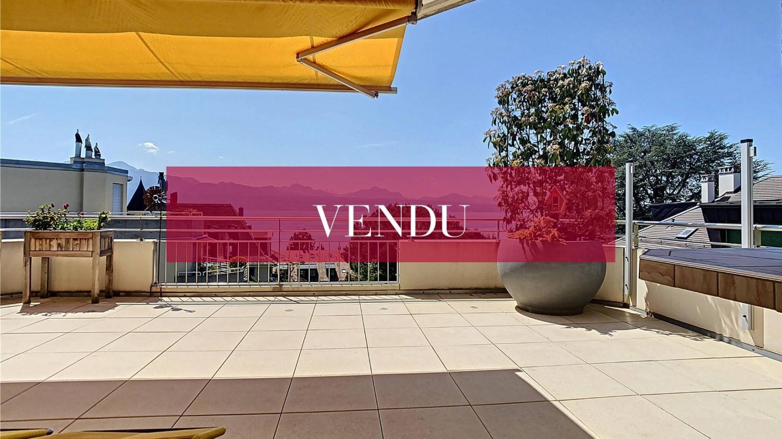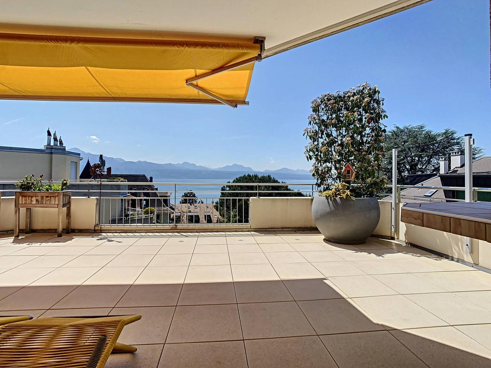 Dieses Penthouse erstreckt sich über die gesamte oberste Etage einer kleinen Wohnanlage mit 4 Wohnungen und verfügt über eine Panoramaterrasse von ca. 115 m2 mit Blick auf den See und die Alpen.