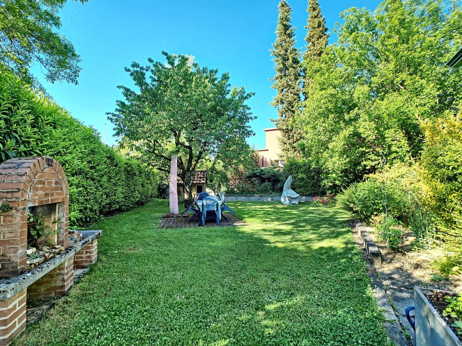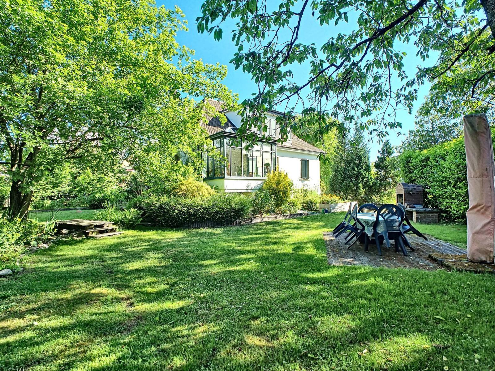 Ein schöner und großer gepflegter Garten mit verschiedenen Baumarten und Obstbäumen, eine Terrasse sowie mehrere Außenparkplätze runden dieses seltene Anwesen ab.