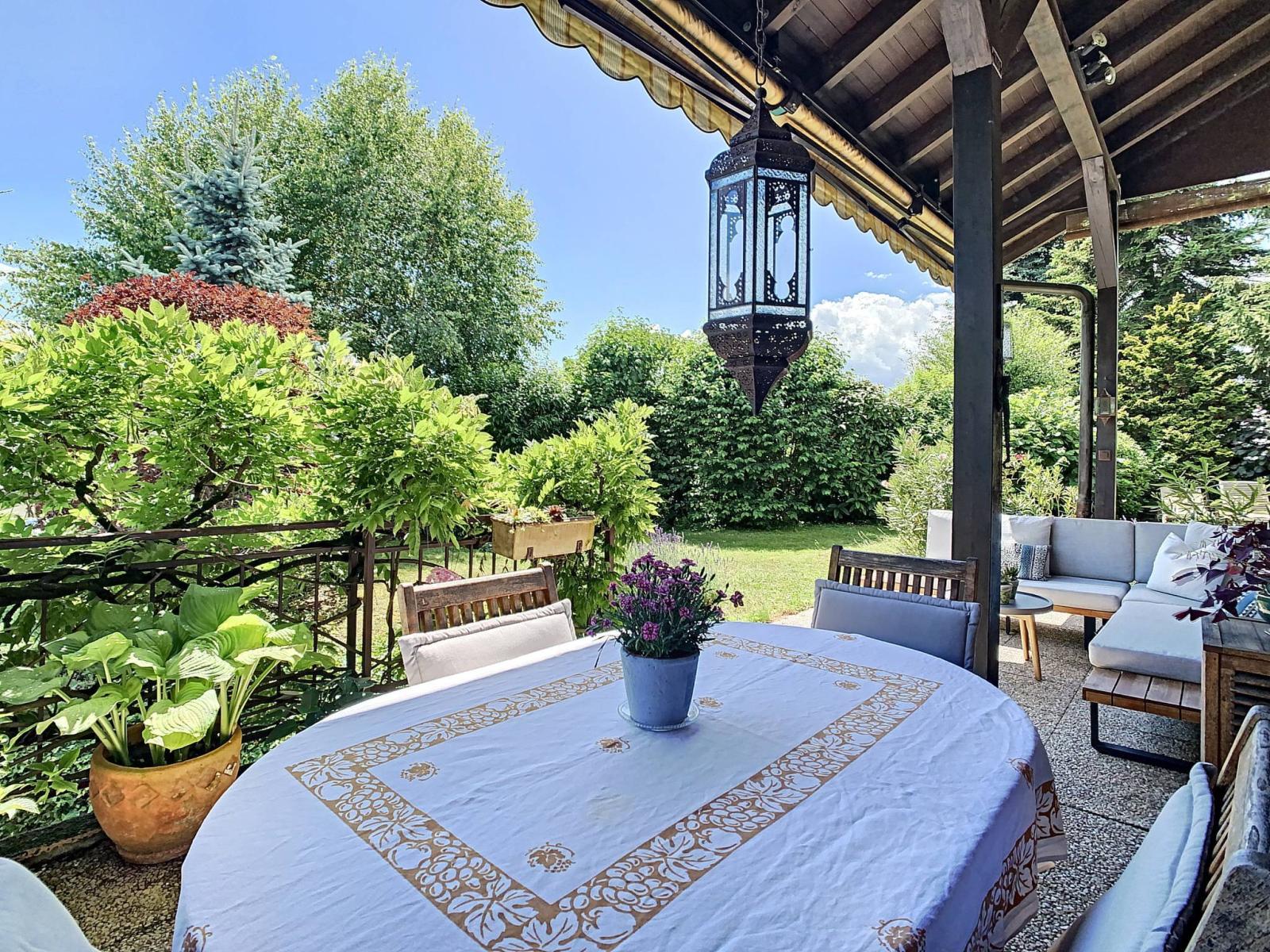 Es verfügt über einen gut bepflanzten und umzäunten Garten, mehrere Terrassenbereiche, eine Garage für 1 Auto mit Werkstattraum und mehrere Außenparkplätze, die dieses charmante Einfamilienhaus vervollständigen.