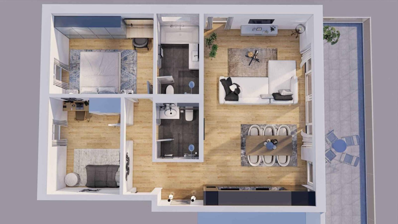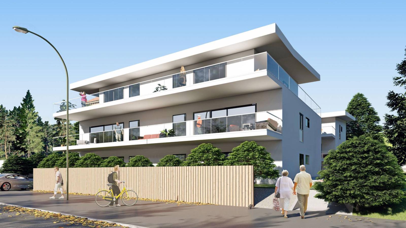 Die Wohnungen dieses Projekts mit 3,5 bis 5,5 Zimmern verfügen alle über große Balkone oder Terrassen für die Unterbringung im Erdgeschoss und im Dachgeschoss.