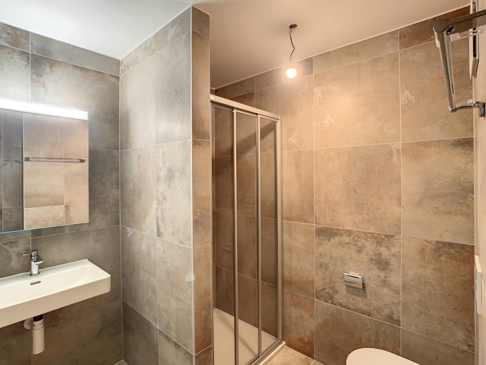 Es besteht aus einer Eingangshalle mit Garderobe, einem großen Wohnzimmer/Küche von 41 m², einem geräumigen Hauptschlafzimmer von 20 m² mit eigenem Bad, einem weiteren Schlafzimmer von 16 m² sowie einem WC/Dusche ausgestattet mit Anschluss für Waschsäulen.