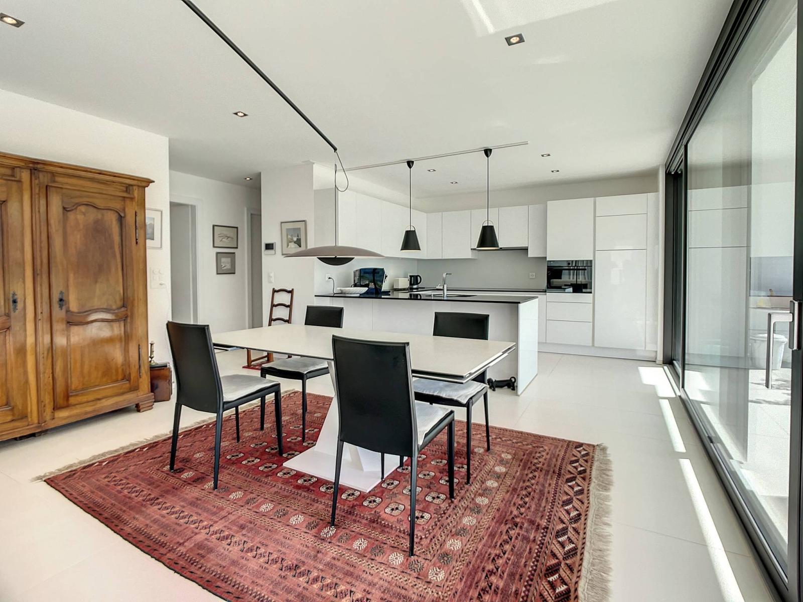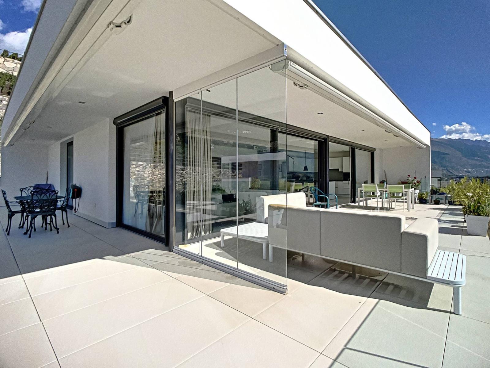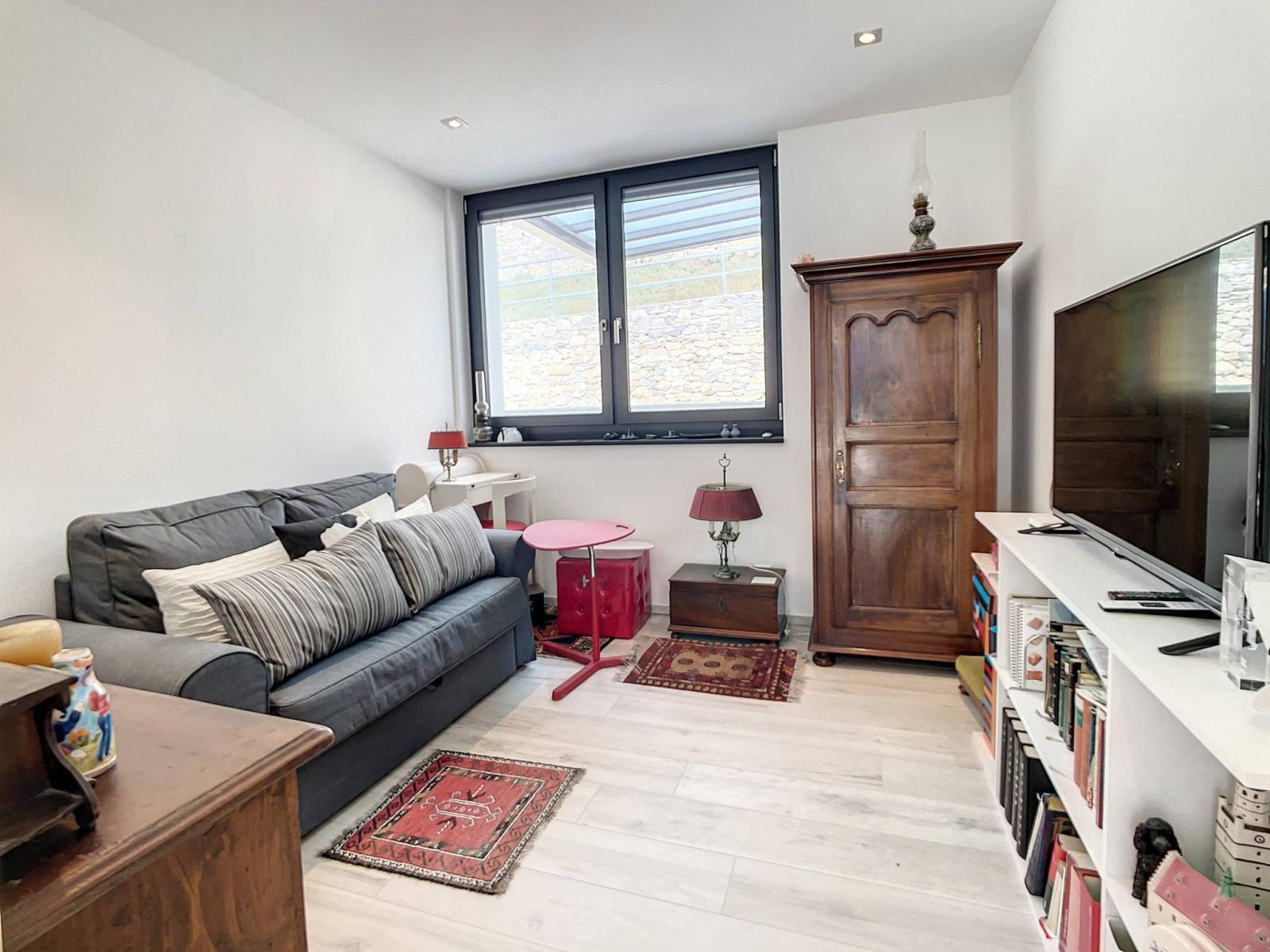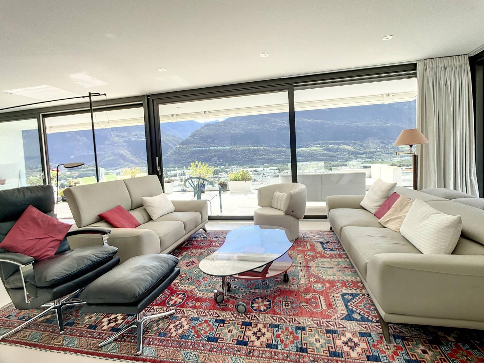Das schöne, vollständig verglaste Wohnzimmer bietet dank seiner Süd-, Ost- und Westausrichtung hervorragendes Licht und direkten Zugang zur sehr großen gepflasterten Terrasse von ca. 100 m², die eine außergewöhnliche und freie Aussicht bietet.