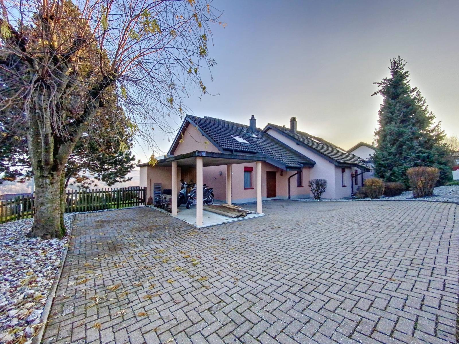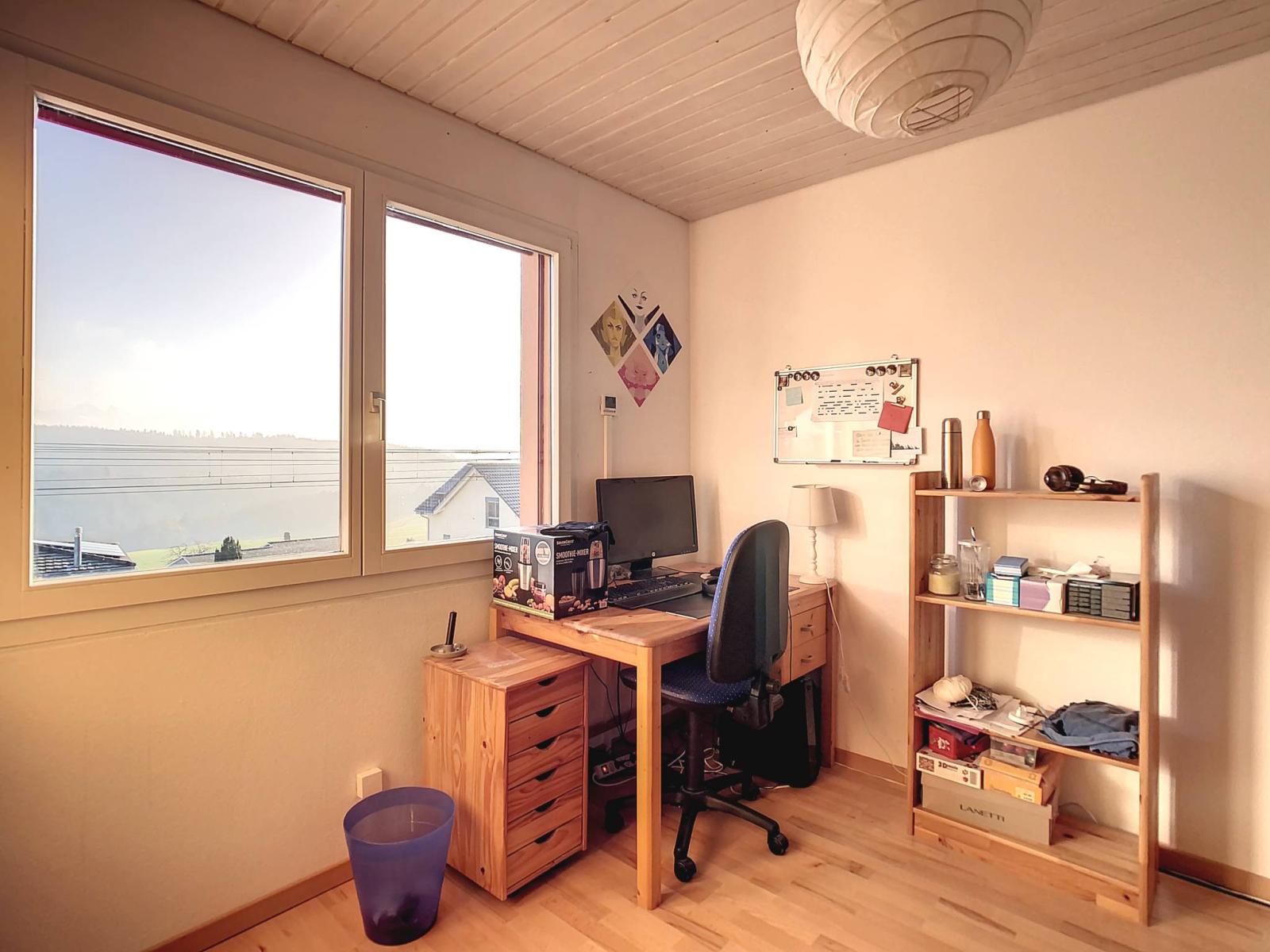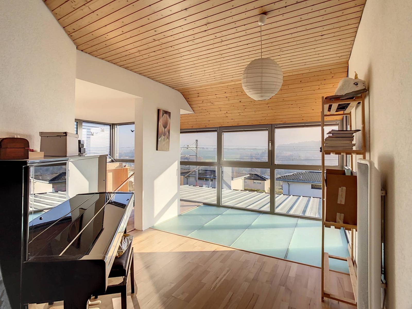 Halb ausgebaut verfügt es über insgesamt 6 Halbgeschosse und bietet Ihnen eine Nutzfläche von 236 m², davon 182 m² Wohnfläche. Dieses nach Süden ausgerichtete Haus wird Sie mit seinen vielen Vorzügen, insbesondere seiner freien Aussicht, überzeugen der Voralpen sowie seine offene Küche im großen und geräumigen Wohnzimmer, ausgestattet mit einem Kamin mit Wärmerückgewinnung.