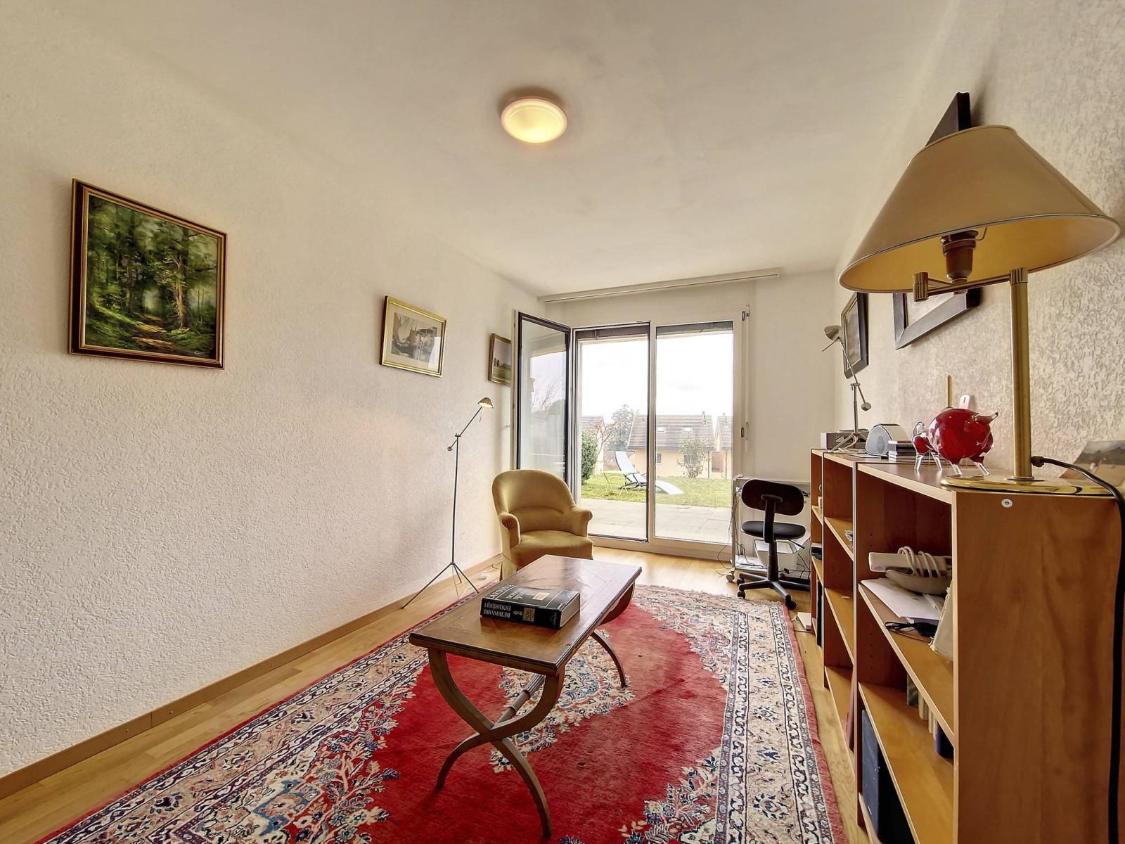 Eine hübsche 3,5-Zimmer-Wohnung mit effizienter Aufteilung im Gartengeschoss einer gut erhaltenen PPE. Es verfügt über 2 Schlafzimmer (ca. 13,5 m² und 15 m²) und 2 Badezimmer, mit einem hellen Wohn-/Esszimmer von ca. 25 m² in „L“-Form mit der Küche von ca. 8 m². Tatsächlich verfügen die Schlafzimmer und das Wohnzimmer über Erkerfenster, die einen direkten Zugang zur Südterrasse und zum Garten ermöglichen. Die Wohnung verfügt über zahlreiche Einbauschränke und eines der beiden Badezimmer wurde in poliertem Beton renoviert, was ihr ein modernes Aussehen verleiht Stil.