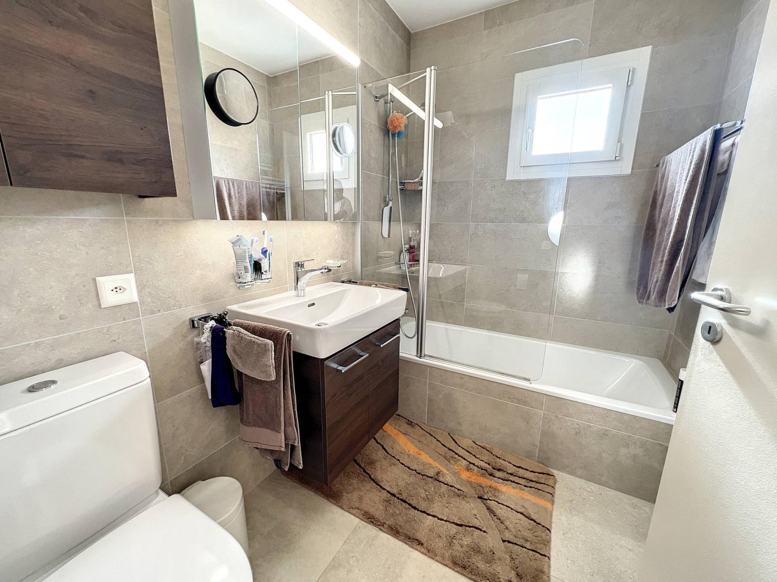 Die obere Etage, die dem Schlafbereich gewidmet ist, umfasst ein Hauptschlafzimmer mit Balkon und eigenem Bad, zwei weitere Schlafzimmer sowie ein Duschbad mit WC, Waschbecken und Fenster.