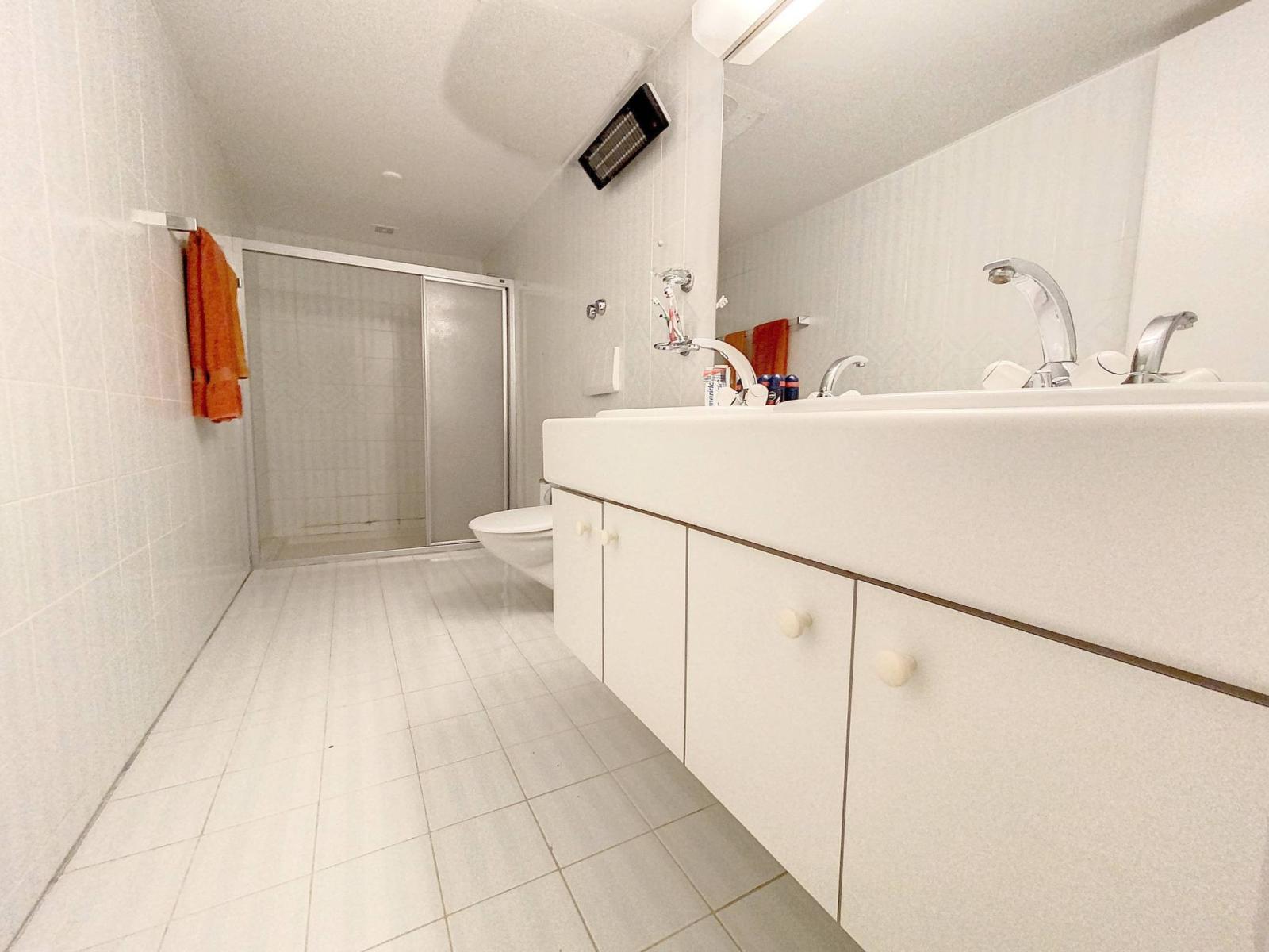 Das Wohnzimmer mit Kamin ist geräumig und bietet Zugang zum Balkon. Die Küche und eines der Schlafzimmer haben Zugang zur Terrasse im Obergeschoss, während drei weitere Schlafzimmer Zugang zur Terrasse im Untergeschoss haben.