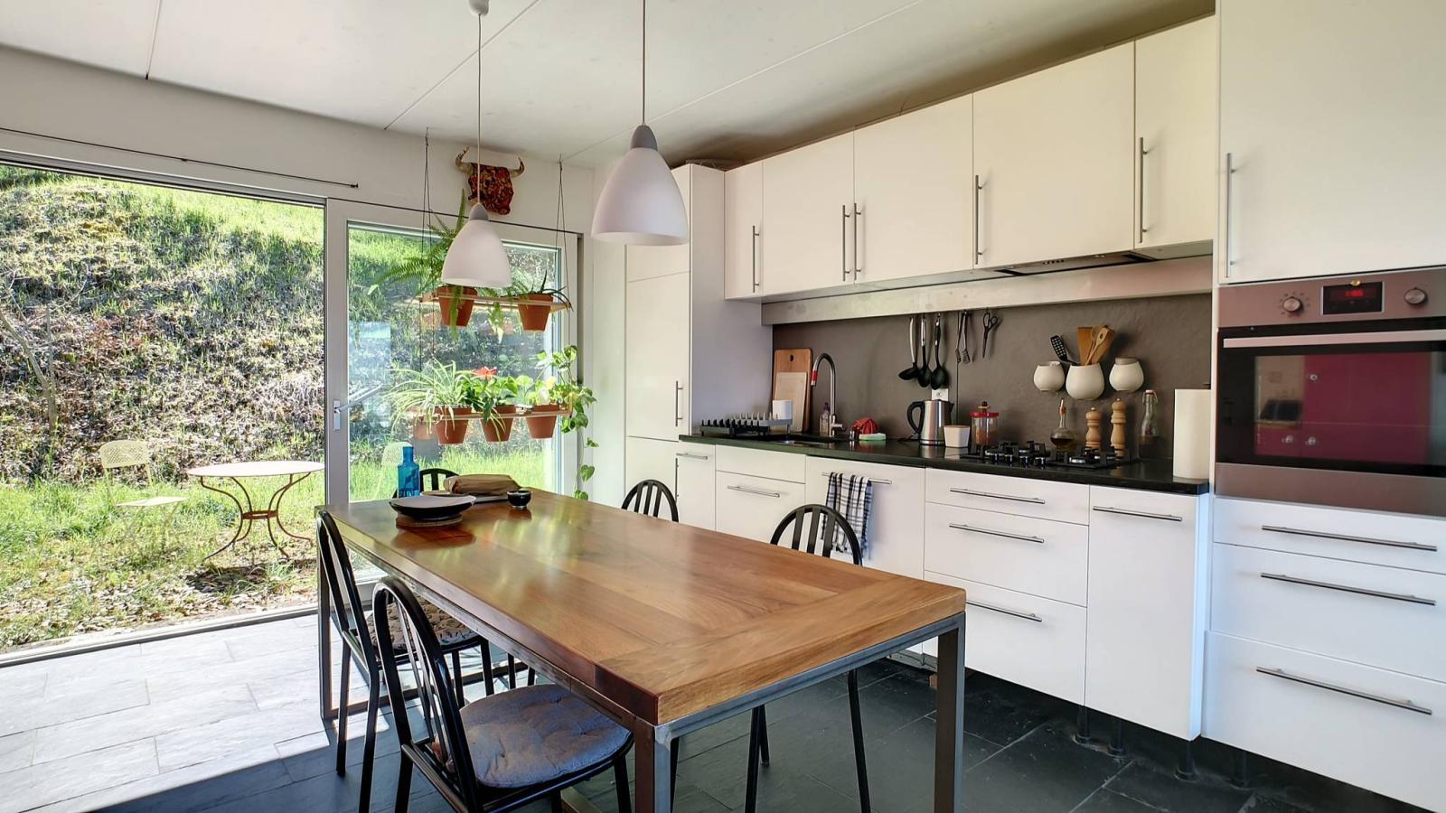 Die 2013 mit hochwertigen Materialien erbaute Villa profitiert von einer modernen und durchdachten Architektur, die ihren Bewohnern funktionale Räume sowie sehr schönes natürliches Licht von morgens bis abends bietet. Die großzügige Wohnfläche von ca. 210 m² verteilt sich auf 2 Ebenen und umfasst derzeit eine eigenständige 2,5-Zimmer-Unterkunft im Erdgeschoss. Die Aufteilung wurde so gestaltet, dass jedes Zimmer einen schönen Blick nach draußen bietet.