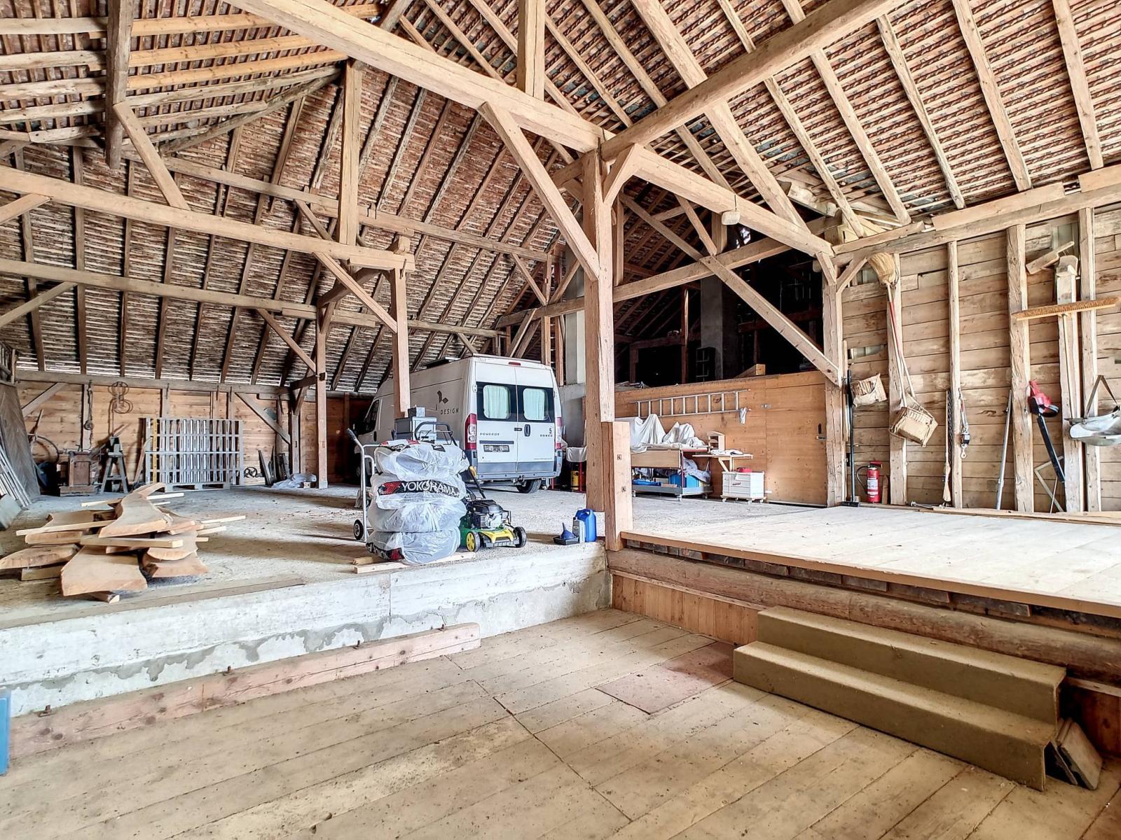Der Scheunenteil bietet ein immenses Volumen mit einem Keller, einem überdachten Bereich, zwei großen Innengaragen (gute Deckenhöhe), einem Werkstatt-/Dachbodenbereich sowie einem stillgelegten ländlichen Bereich, der für eine unabhängige Tätigkeit oder zur Schaffung zusätzlicher Unterkünfte genutzt werden kann .