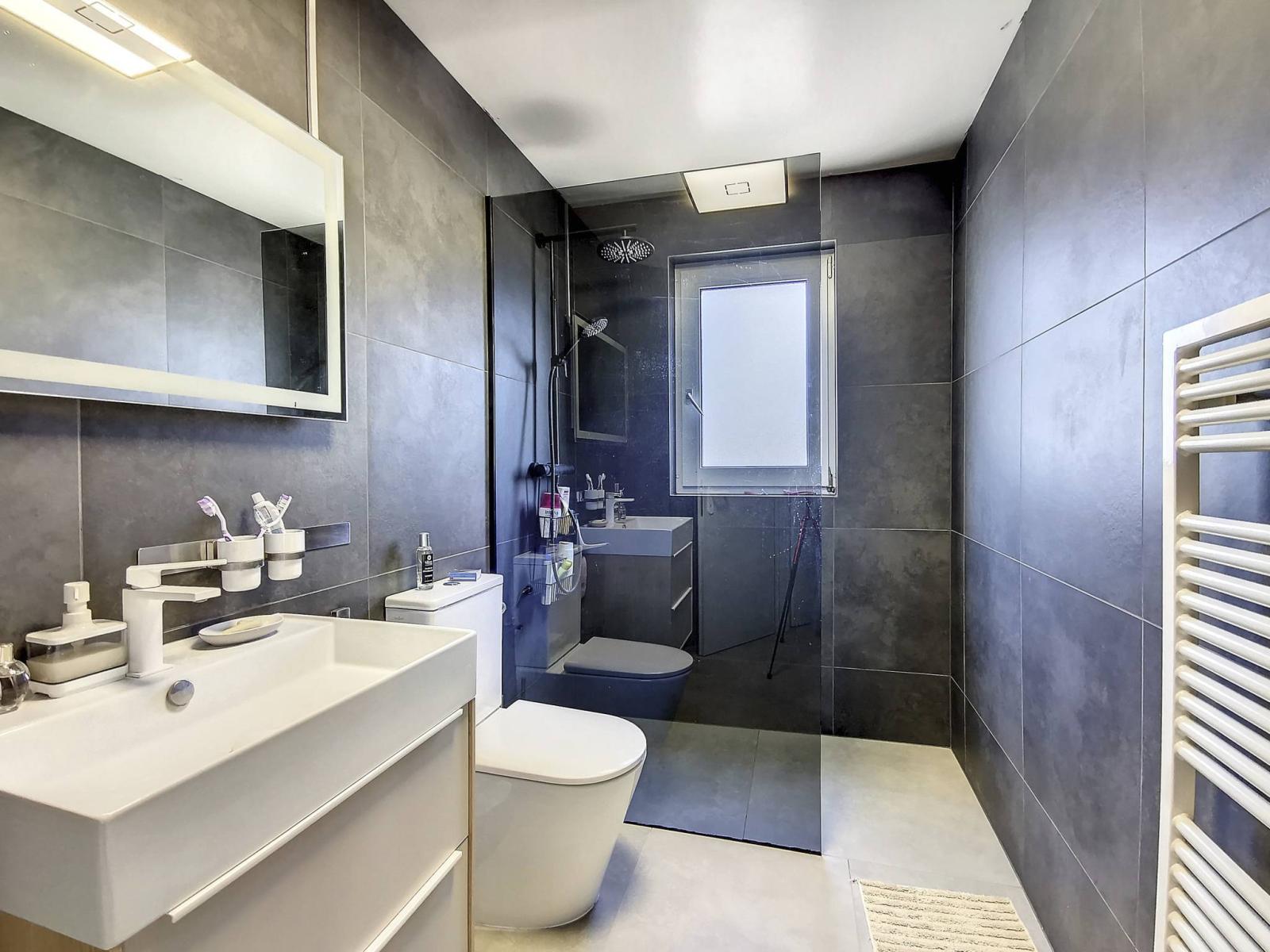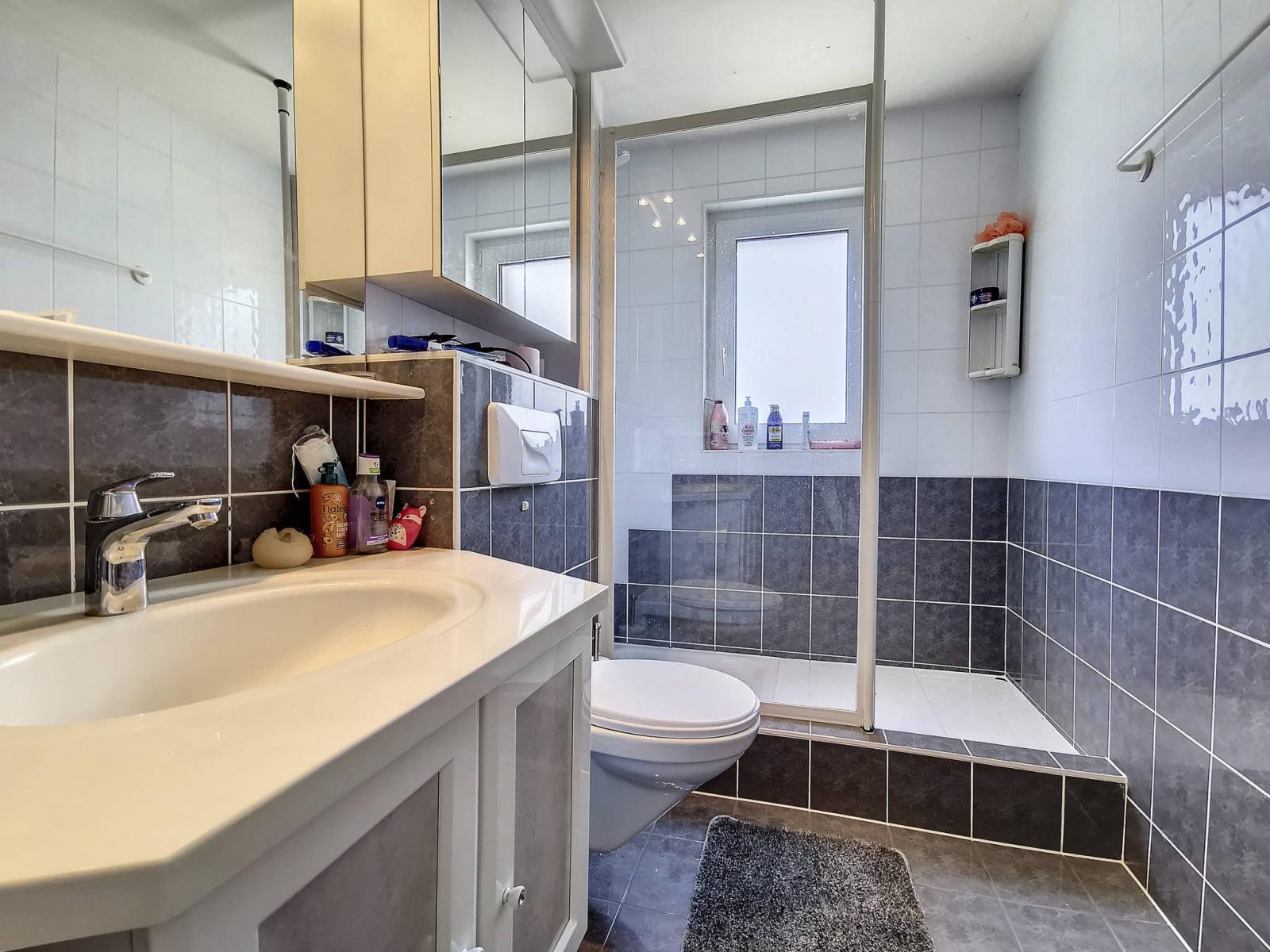 Es verfügt über eine Eingangshalle, eine zum Wohnzimmer offene Küche mit Zugang zur Terrasse und zum Garten, 3 Schlafzimmer, ein Badezimmer/WC und ein Duschbad/WC.