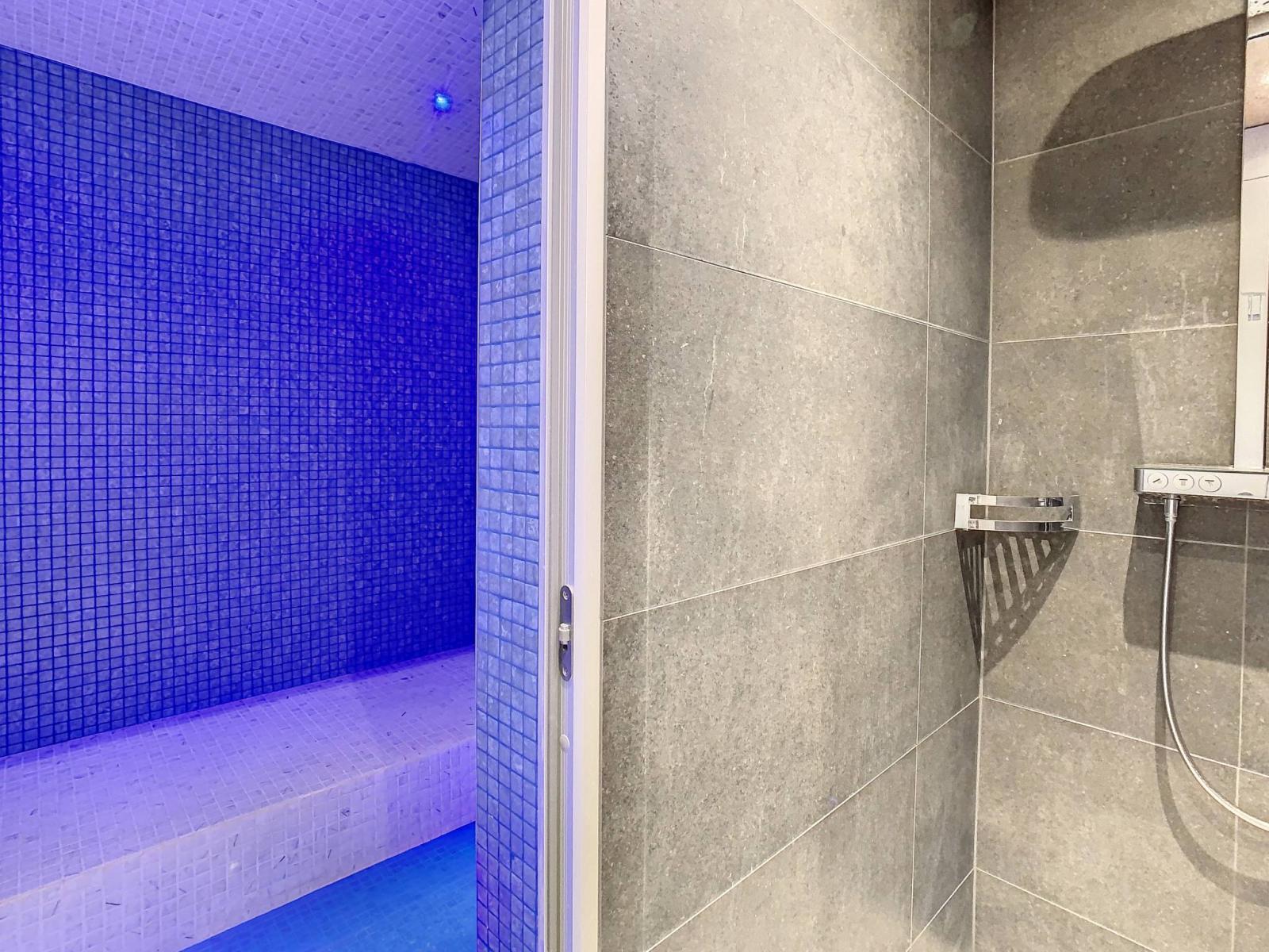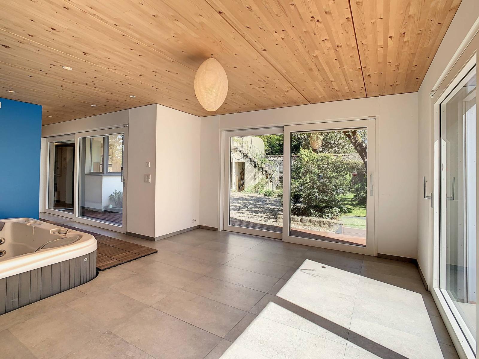 Es verfügt über einen Whirlpool mit großen Erkerfenstern, durch den Sie den Garten und die umliegende Natur optimal nutzen können, über ein wunderschönes Mosaik-Hammam und ein angrenzendes Badezimmer.
