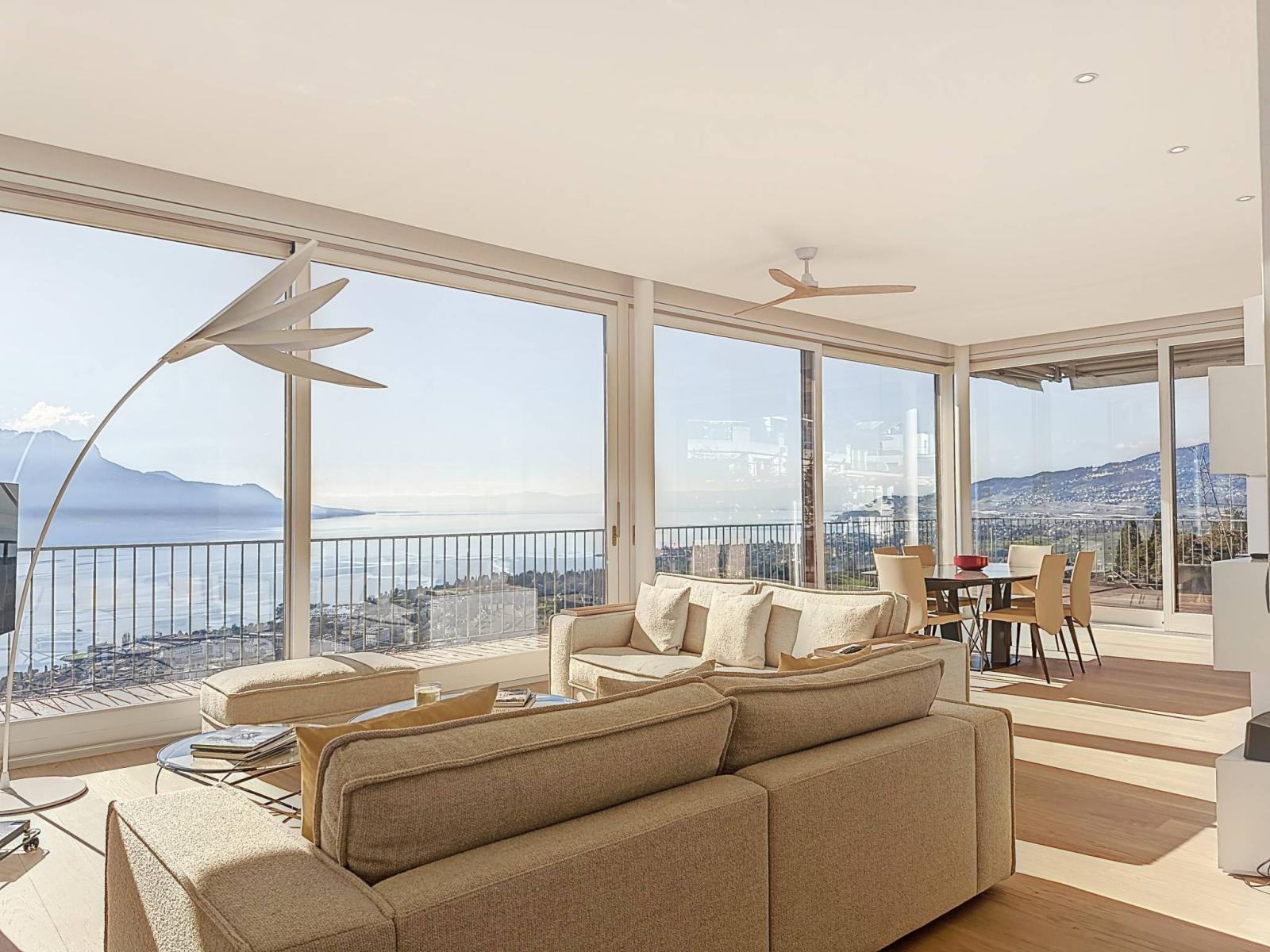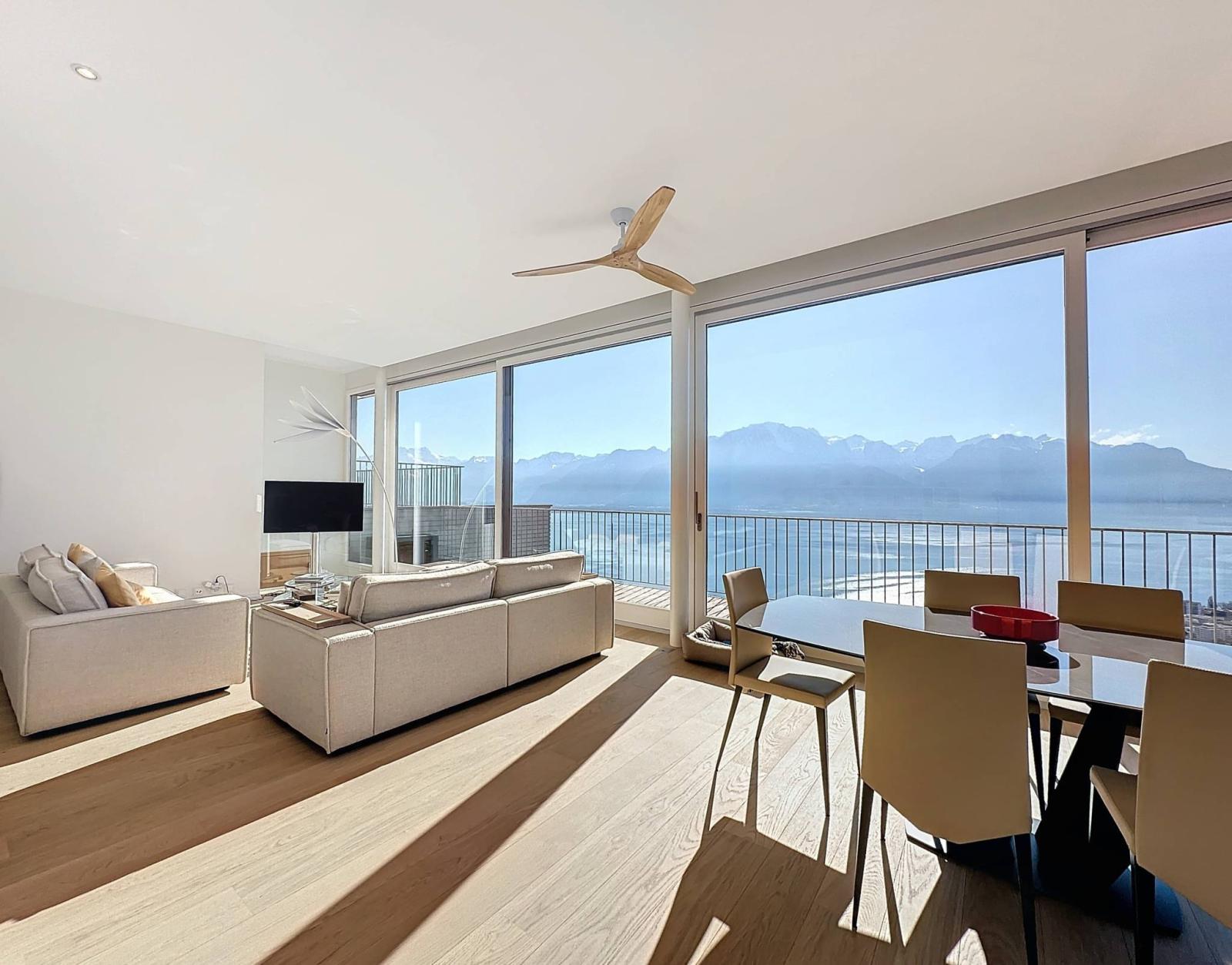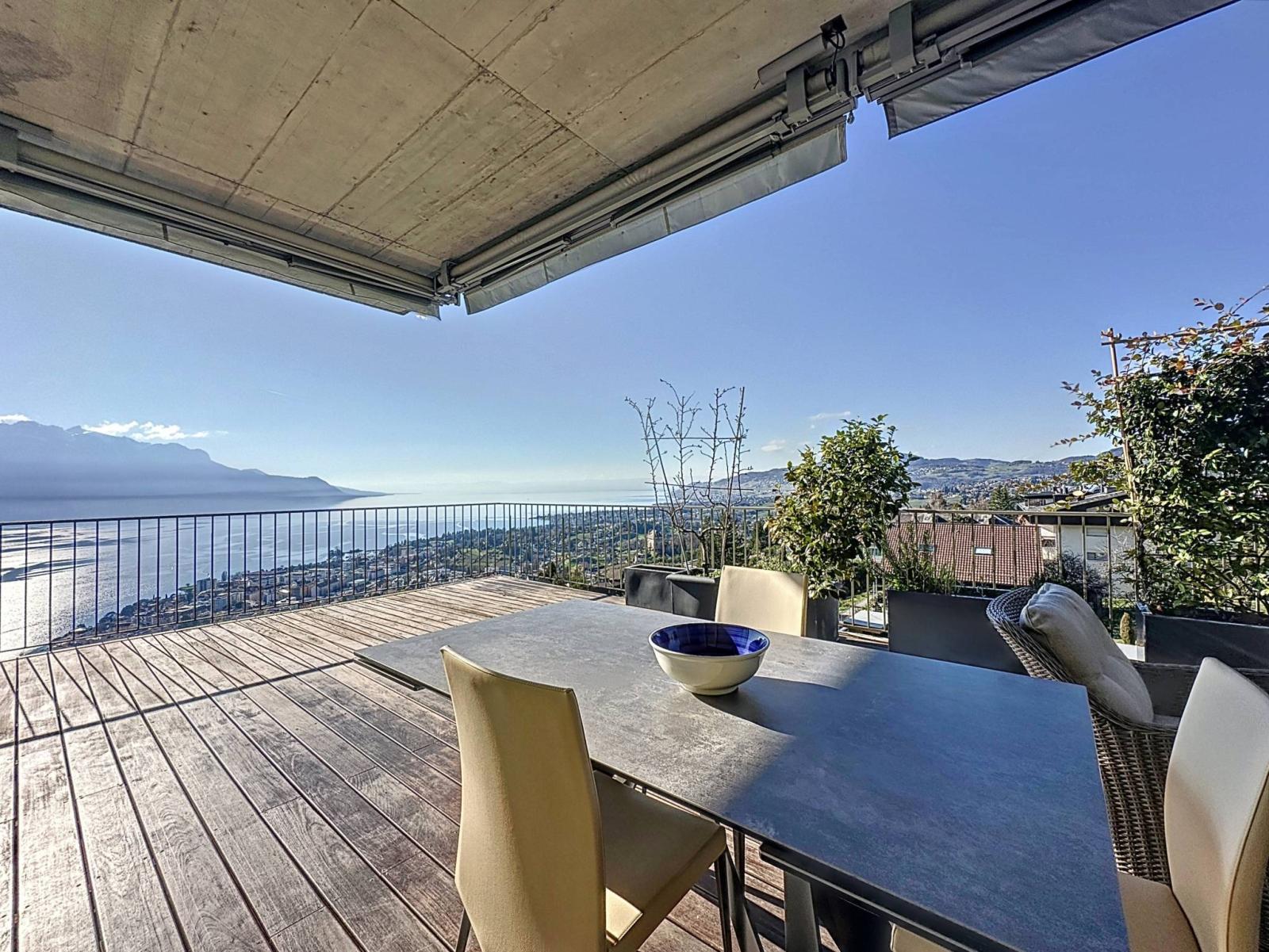 Dieses prächtige Penthouse befindet sich im charmanten Dorf Chernex auf den Höhen von Montreux und nimmt eine dominante Lage in einer sehr ruhigen, idyllischen Umgebung ein, umgeben von viel Grün.