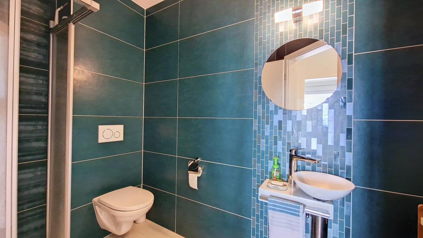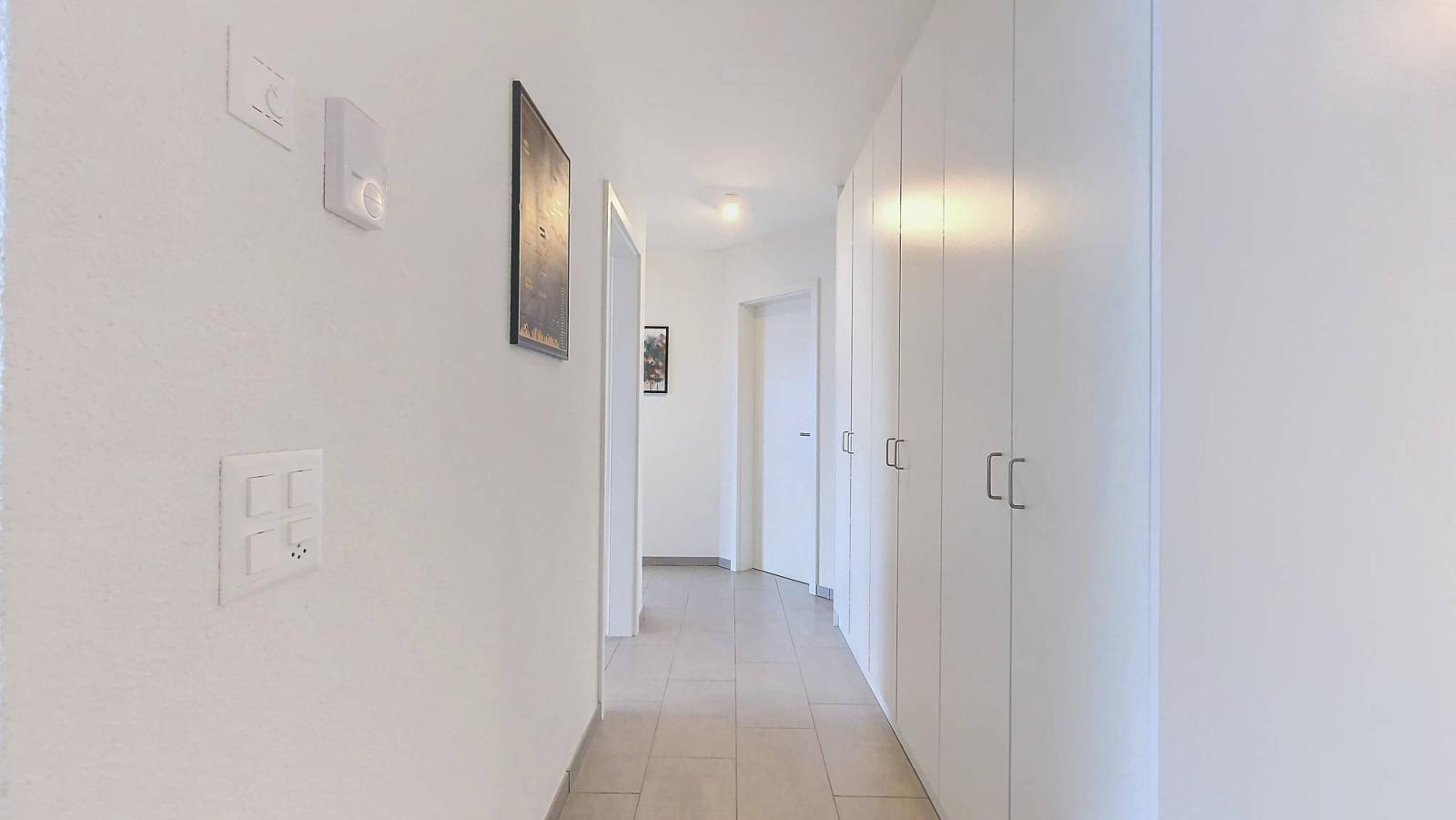 Der Innenraum umfasst eine Eingangshalle mit Wandschränken, ein Dusch-WC und zwei Schlafzimmer, darunter eine Mastersuite mit angrenzendem Badezimmer. Die voll ausgestattete Küche öffnet sich zum Wohnzimmer, während ein großer Südwestbalkon einen ruhigen Blick auf ein vor Lärmbelästigung geschütztes Wohngebiet bietet.