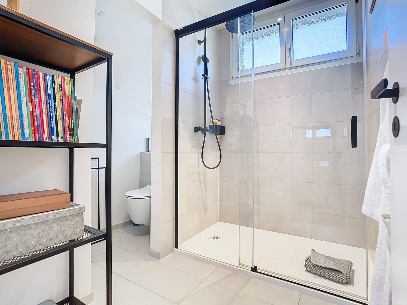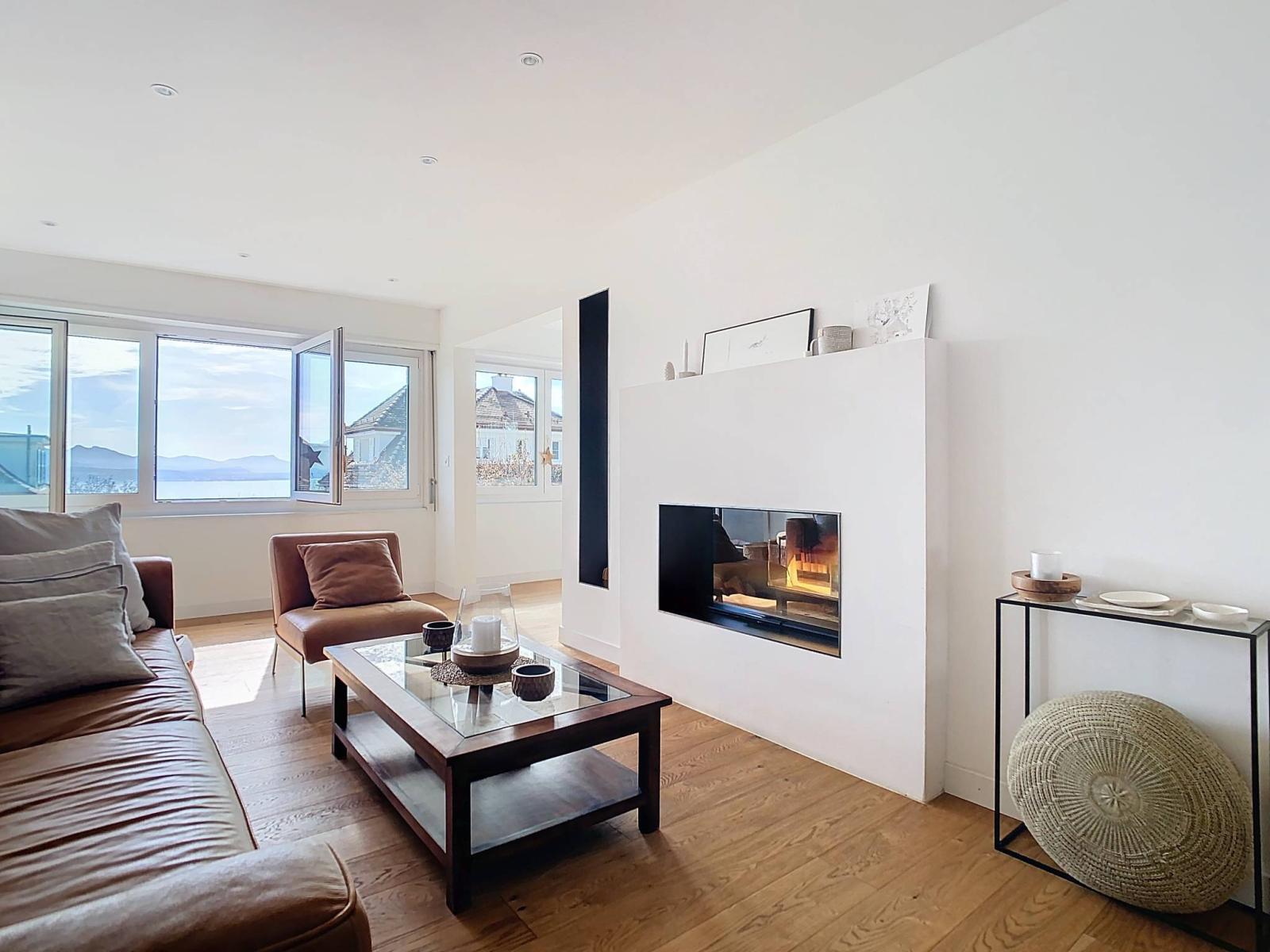 • Das Erdgeschoss, ein zentraler Wohnraum mit großer Fläche und Volumen, wird zweifellos als Ort für Empfänge und Abendessen dienen, sowohl drinnen als auch draußen in warmer Atmosphäre auf der Terrasse mit Blick auf die Stadt Lausanne. Diese Etage verfügt insbesondere über ein Schlafzimmer mit eigenem Bad, einem Badezimmer und einem Duschbad.